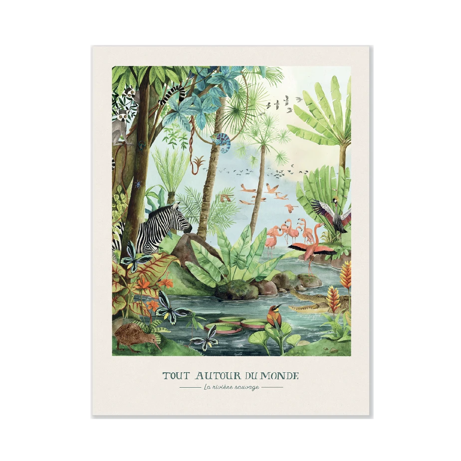 Affiche 30X40cm de la collection Tout autour du monde. Les animaux se rassemblent à la rivière sauvage… Imprimé en France à base d’encres végétales sur du papier certifié FSC. Livrée sous blister.