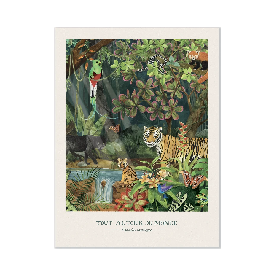 Affiche 30X40cm de la collection Tout autour du monde. Des oiseaux, des tigres, des couleurs, une végétation riche et foisonnante… c’est le paradis exotique! Imprimé en France à base d’encres végétales sur du papier certifié FSC. Livrée sous blister.