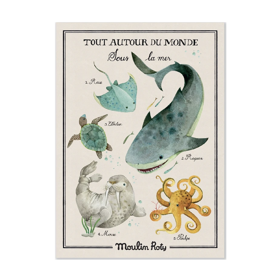 Affiche 50x70cm de la collection Tout autour du monde. Le requin, le poulpe…. une planche naturaliste des animaux vivant sous la mer. Imprimé en France à base d’encres végétales sur du papier certifié FSC. Vendue sous tube.