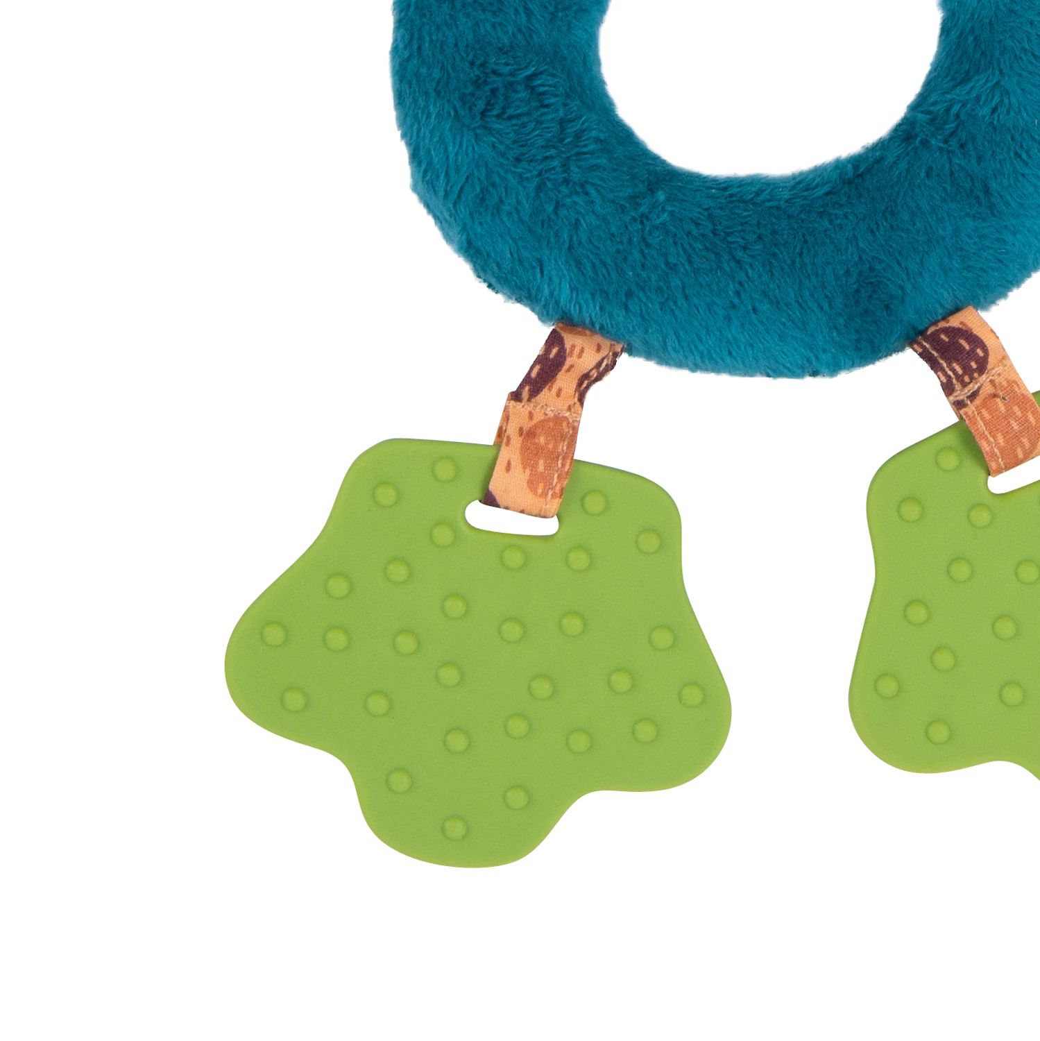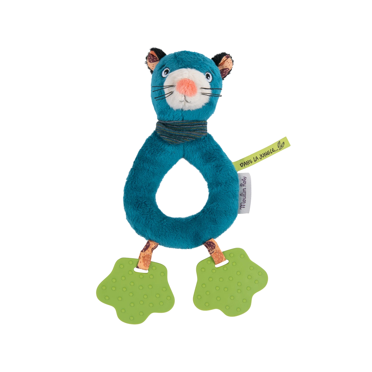 Voici Zimba la plus majestueuse des panthères, transformée en hochet spatules. Facile à saisir grâce à sa forme d’anneau, elle fait du bruit quand on l’agite ! A ses pieds, 2 spatules à mâchouiller pour soulager les poussées dentaires.