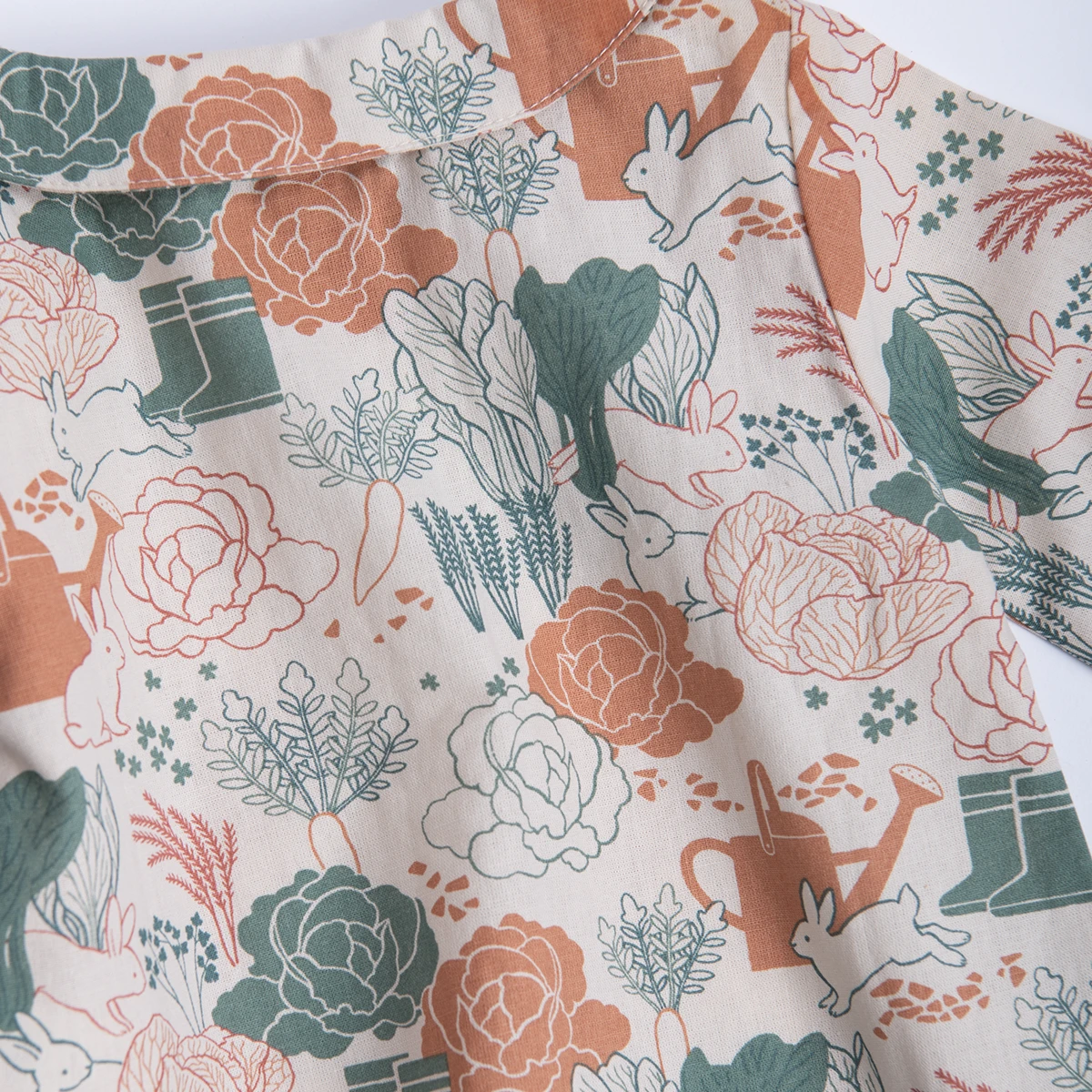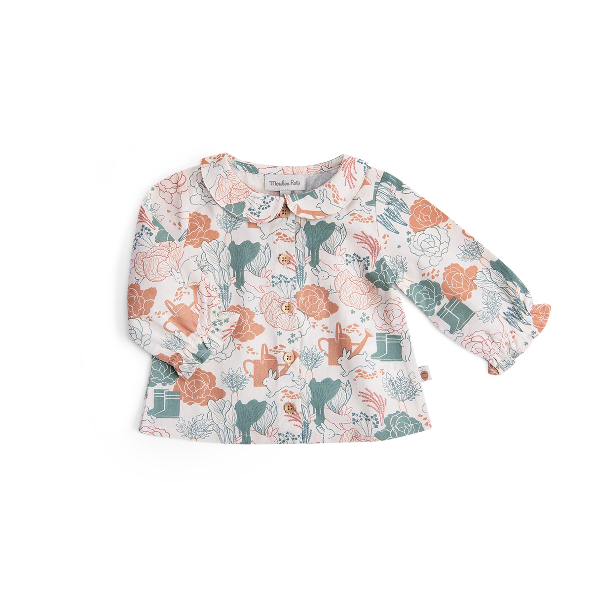 Blouse avec col claudine et poignets élastiqués, 100% coton bio. Imprimé potager en all-over. Ouverture complète par boutons bois.