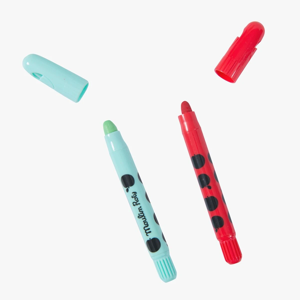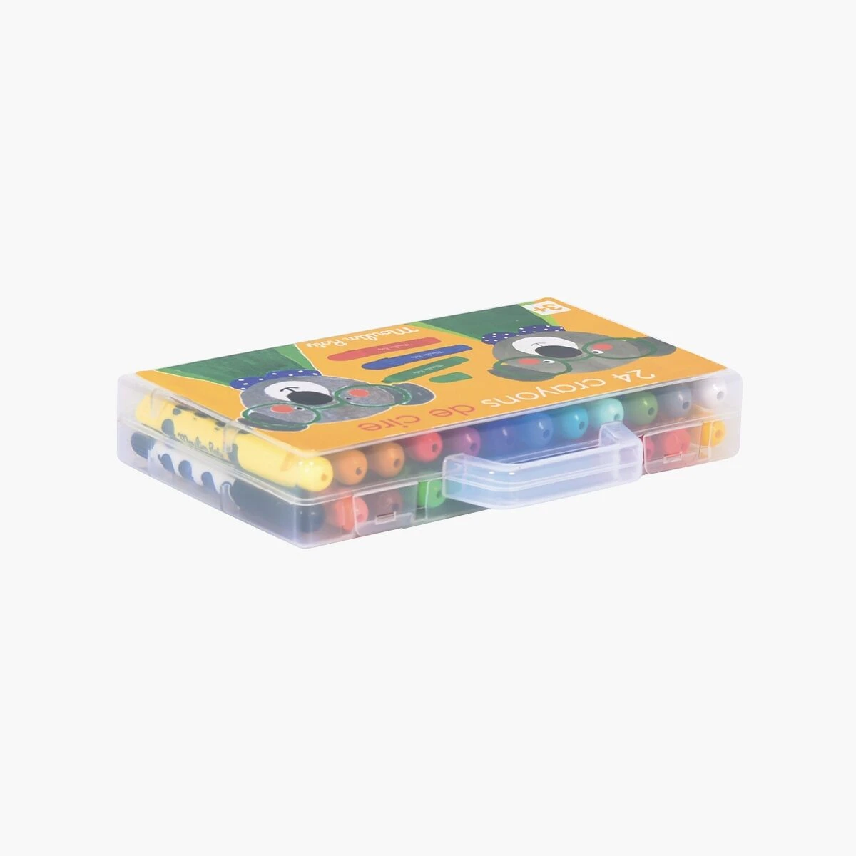 À emmener partout ! Valisette de 24 crayons stylo de cire 1er âge, de belles couleurs qui glissent sur le papier, avec corps en plastique pour ne pas se tacher les mains, bouchon et molette pour faire sortir la mine.Traces sur textile facilement lavables.