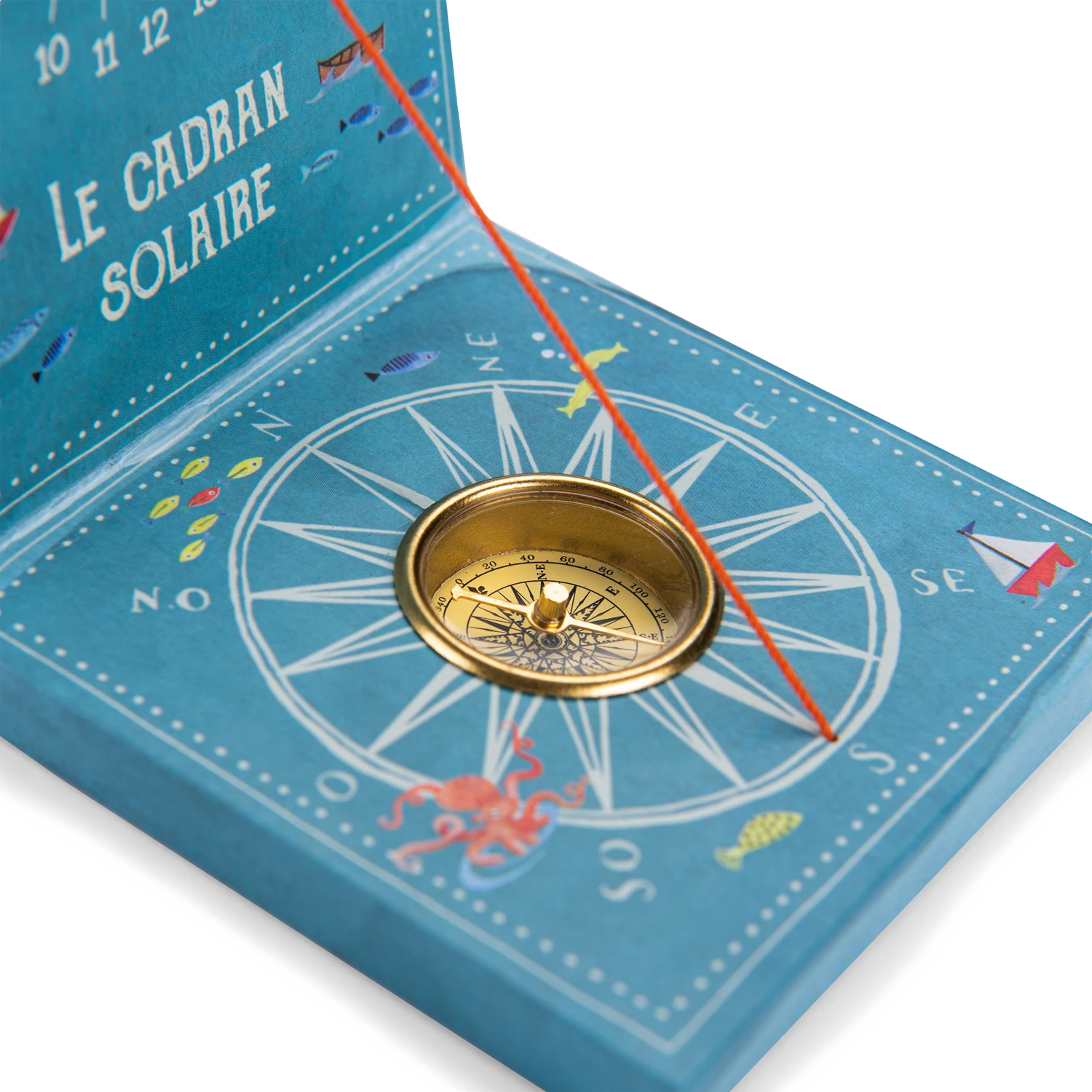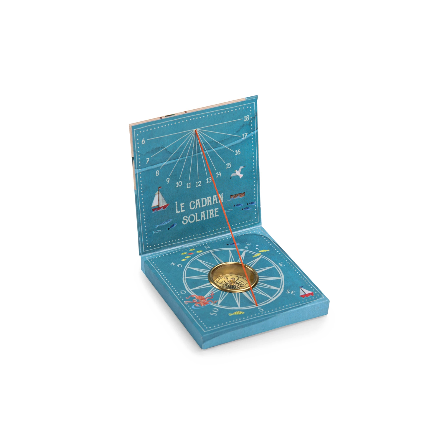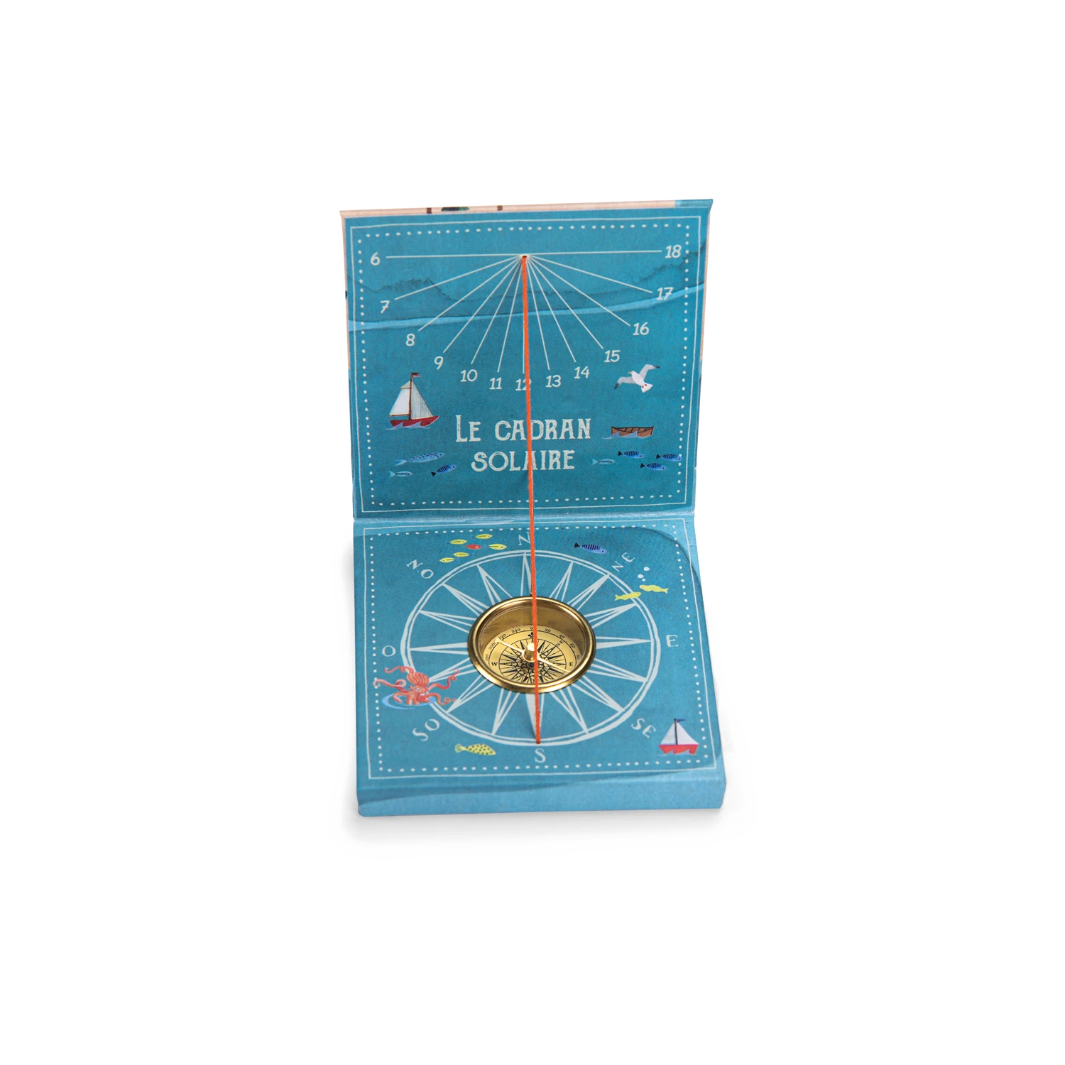 Cadran solaire pour sensibiliser les petits aventuriers au temps et à l’orientation. Il suffit de se mettre au soleil avec l’aiguille positionnée vers le nord, pour que l’ombre du fil indique l’heure solaire.