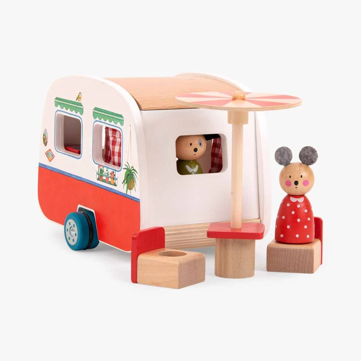 La Grande Famille part en vacances dans sa caravane ! Tout en bois, elle comprend un ensemble de mobilier, des rideaux en tissu vichy et un toit amovible pour les nuits étoilées. Elle peut être associée à la voiture week-end grâce à son attache-remorque. Personnages vendus séparément.