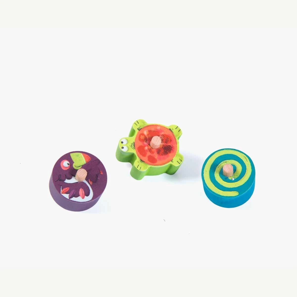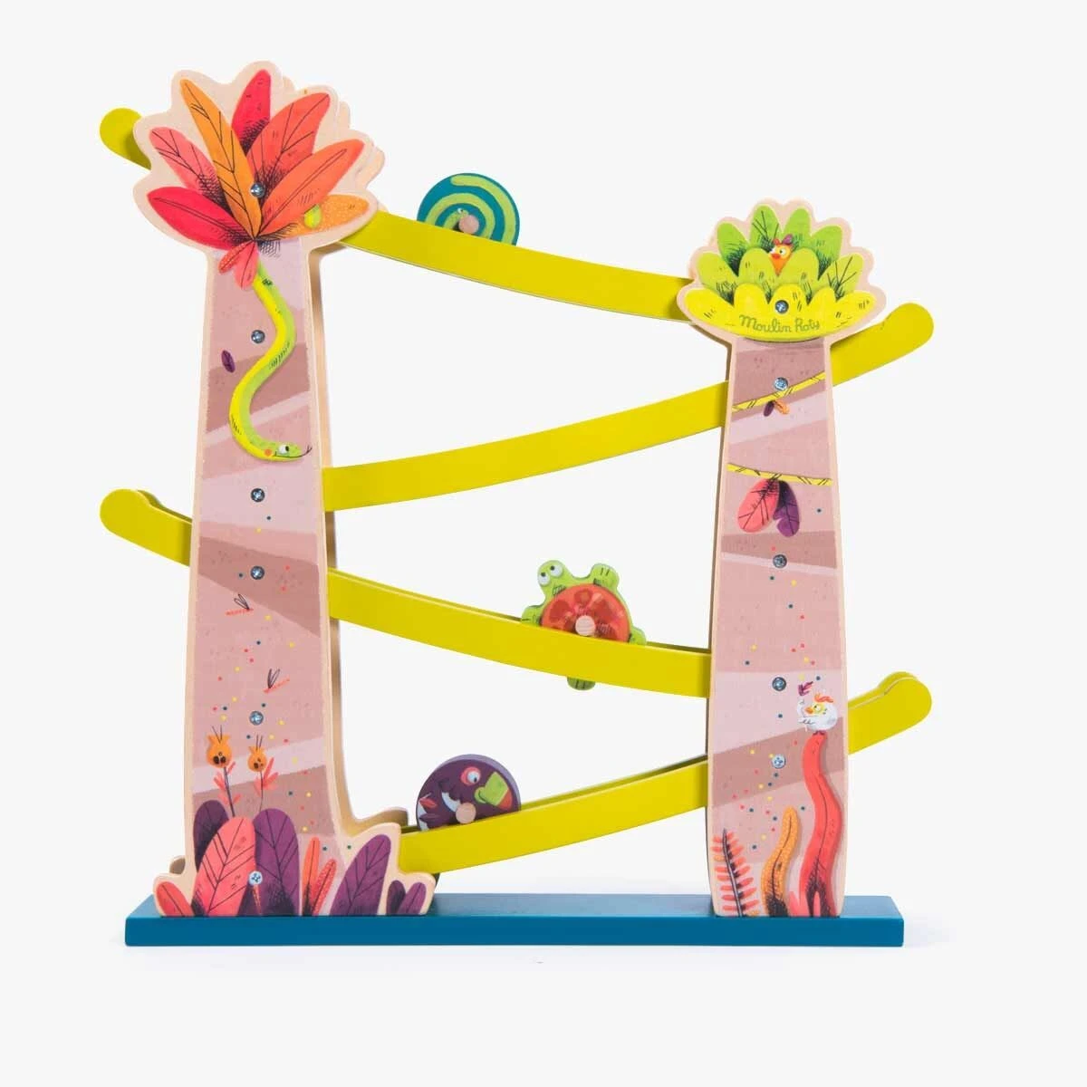 Les toupies dévalent les pentes de la jungle ! Cette cascade est composée de passerelles inclinées reliant deux baobabs en bois, où se laissent rouler les toupies toucan, serpent, et tortue. Leur terrain de jeu préféré !
