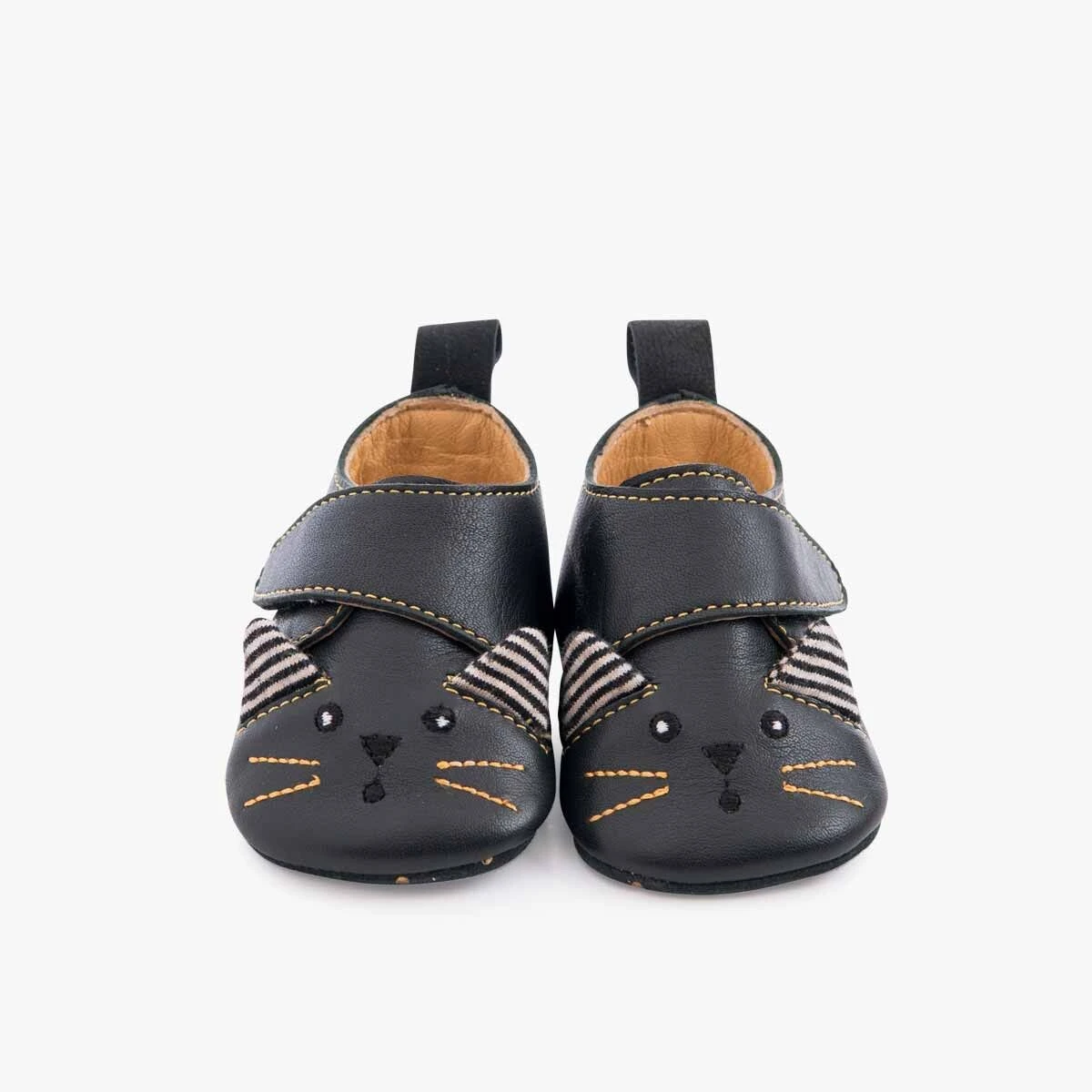 Chaussons en cuir avec fermeture à scratch, brodés d’une tête de chat avec ses oreilles rayées. Ils sont doublés, souples, avec une semelle en cuir velours antidérapante et une semelle intérieure amovible avec mousse, pour le confort de bébé !