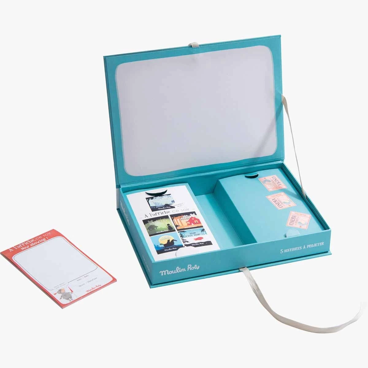 Le cinéma à la maison ! Coffret sur le thème des contes, comprenant un bloc de programmes, des tickets de cinéma, une lampe et 5 disques diapositives. Chaque disque projeté sur le mur raconte une histoire : jeu d’ombres sur fonds colorés et la magie opère