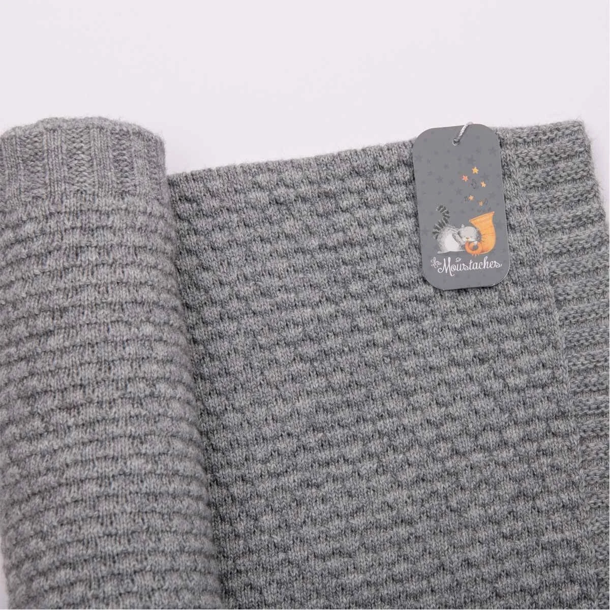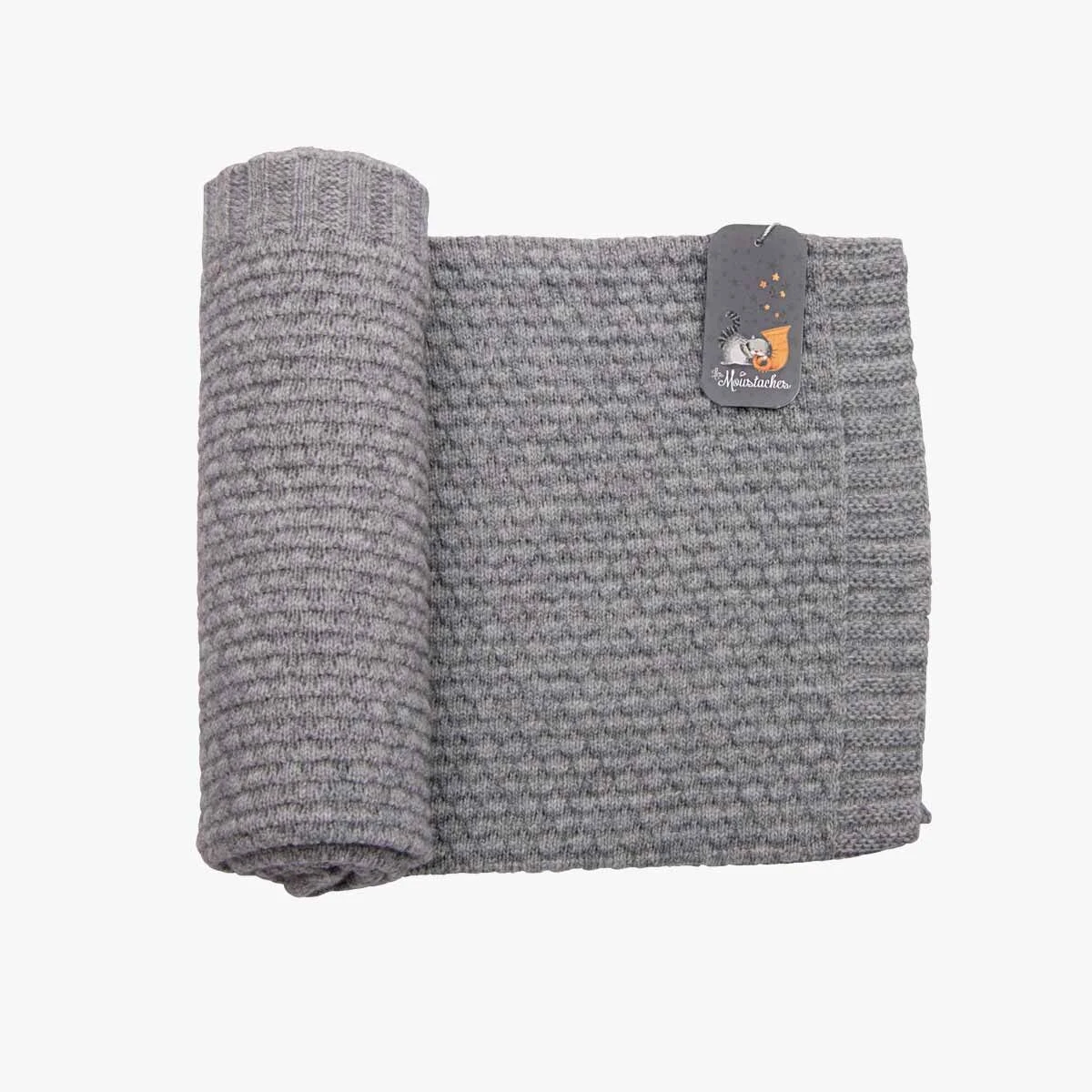 Couverture en tricot grise certifiée OEKO-TEX® qui aide les petits à réguler leur température corporelle grâce aux matières utilisées : 25% coton, 25% viscose, 25% polyamide, 22% laine mérinos et 3% cachemire.