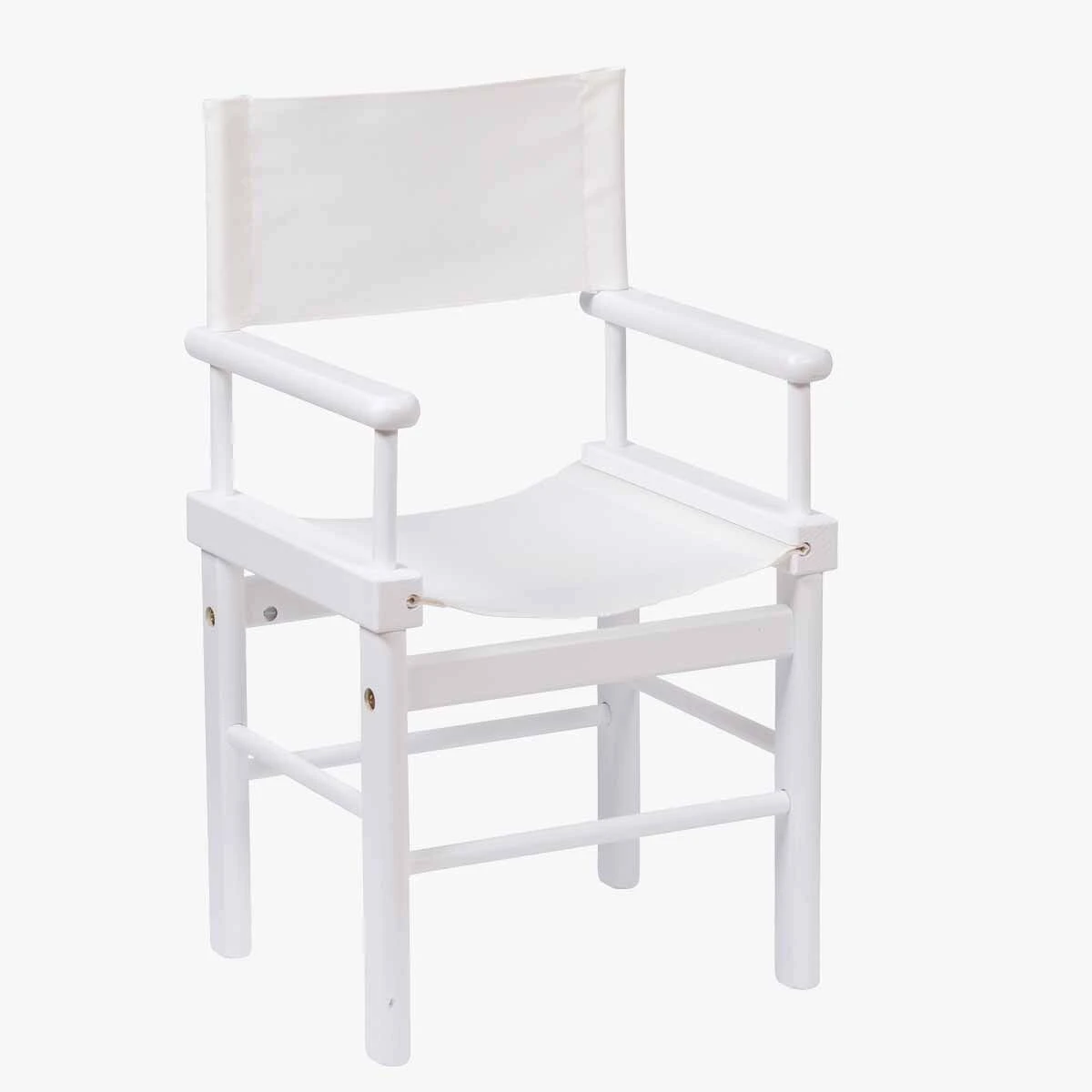 Fauteuil de metteur en scène en bois massif peint en blanc, avec dossier en tissu coton à broder au prénom de l’enfant.