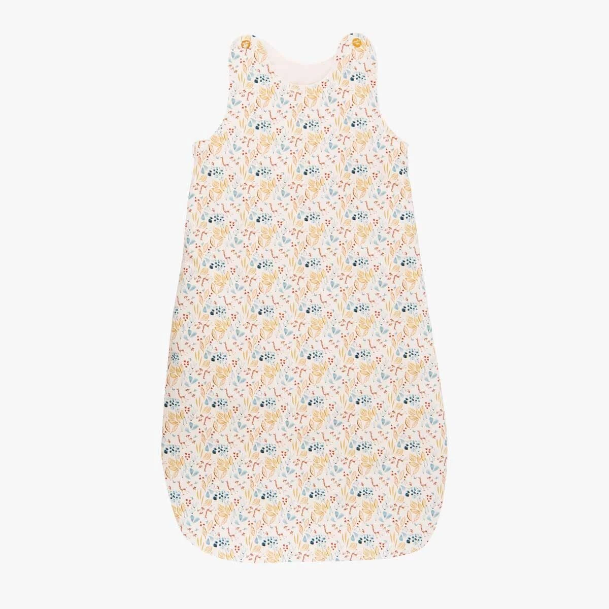 Gigoteuse 0-6 mois, en matière naturelle 100% coton pour laisser respirer la peau de bébé. Imprimée d’un motif floral dessiné à l’aquarelle spécialement pour la collection. Fermeture à glissière et boutons-pression pour un habillage facile.
