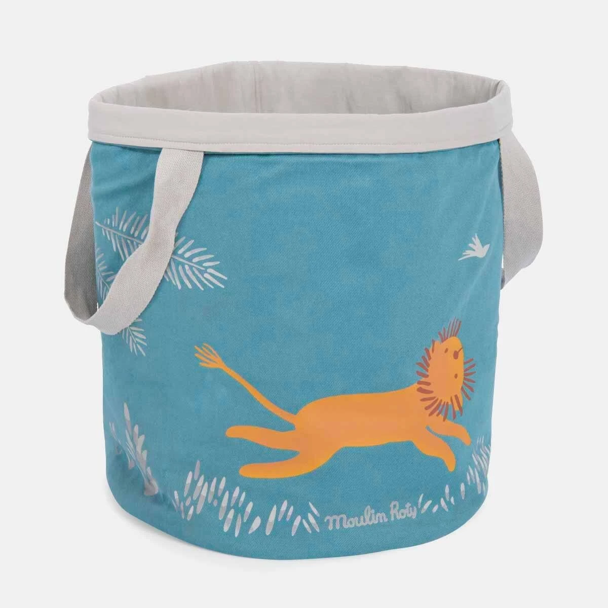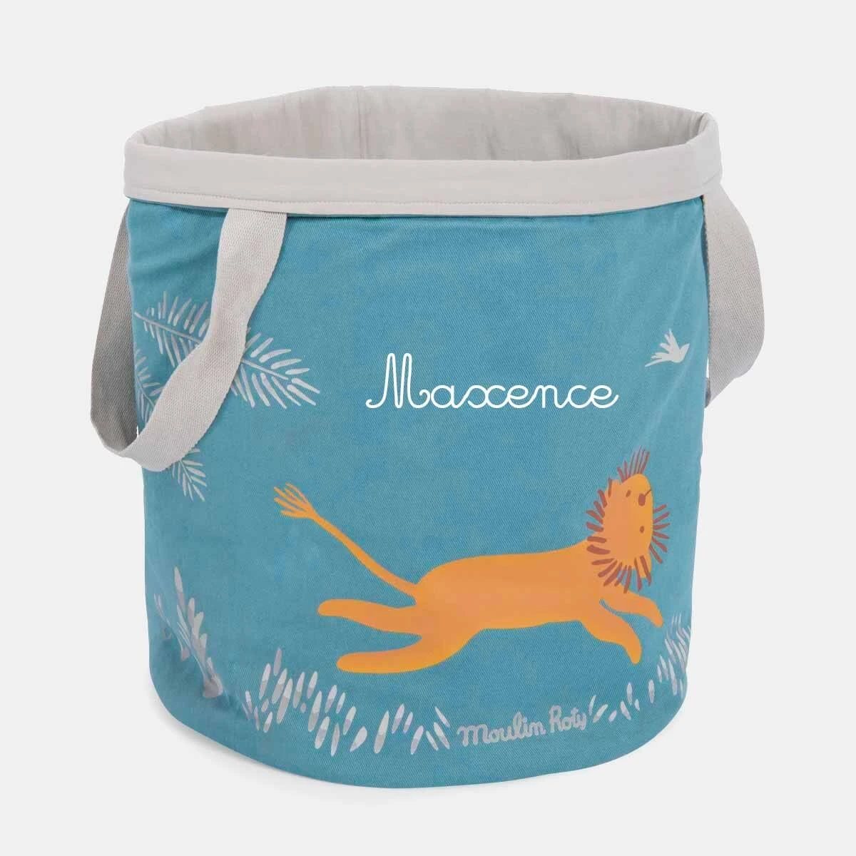 Grand panier en coton bleu-gris avec sérigraphie de Paprika le lion foulant les herbes hautes, accompagné de son ami l’oiseau. Très pratique, il sert à la fois de déco et de rangement dans la chambre d’un enfant. Il peut même être brodé à son prénom !