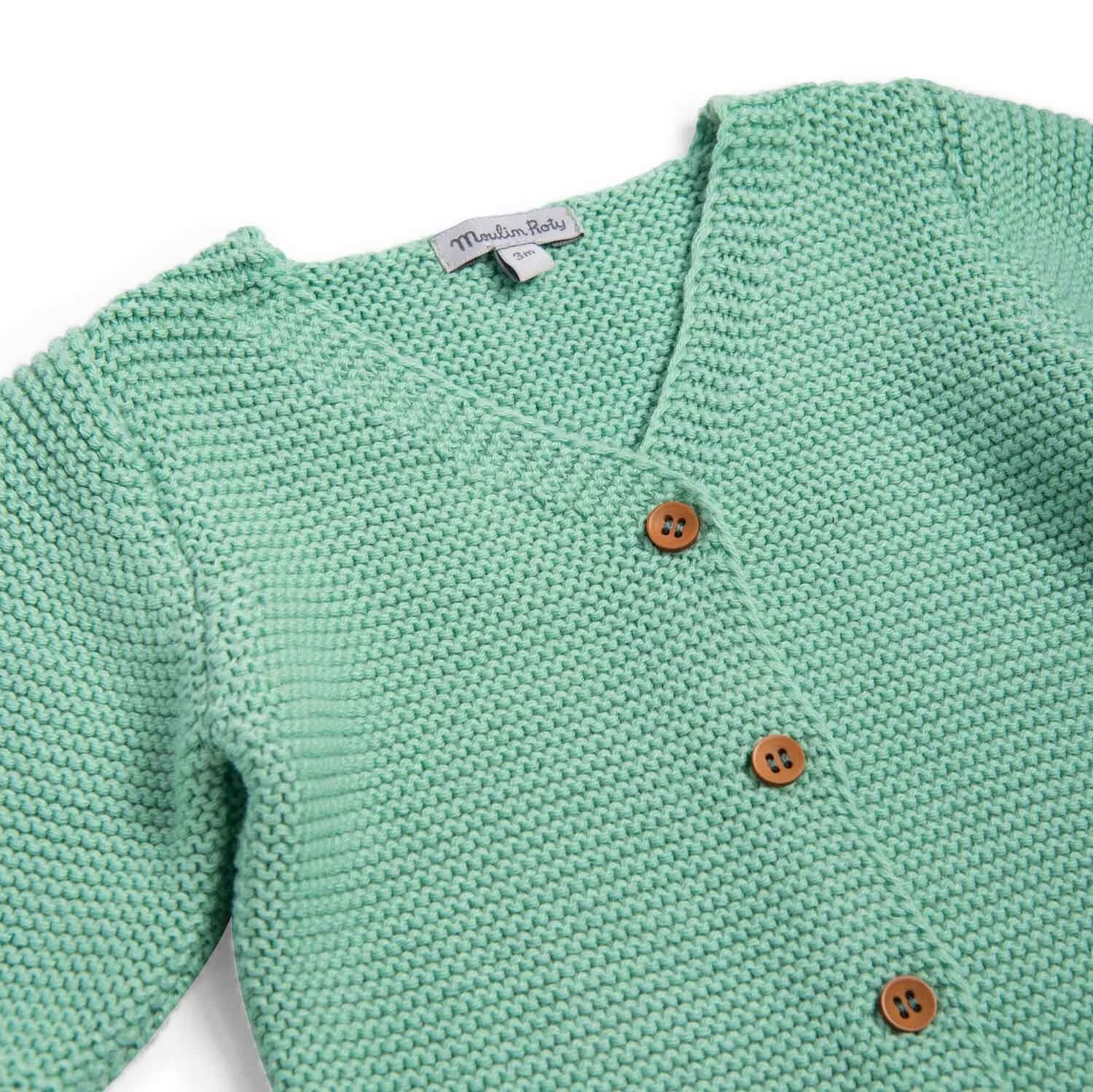 Cardigan vert menthe 100% coton bio, tricoté au point mousse et finement souligné de boutons bois.