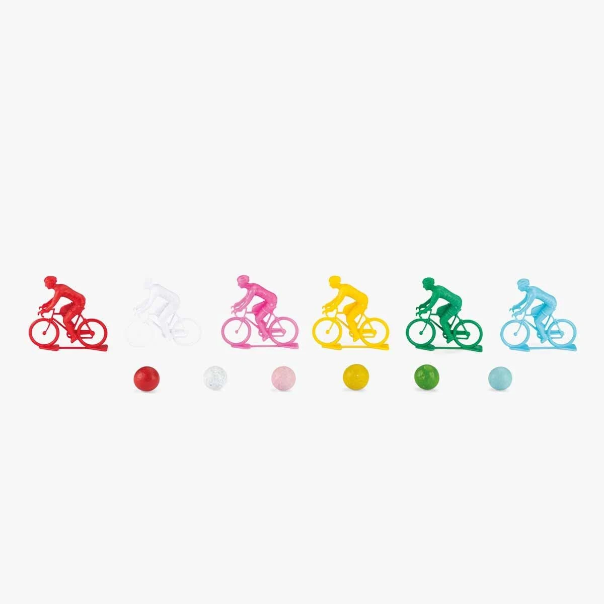 Tracer un circuit, placer votre cycliste sur la ligne de départ, lancer la bille assortie et poser le cycliste où la bille s’arrête. Jouer à tour de rôle, le gagnant est le premier sur la ligne d’arrivée. Jeu conçu et fabriqué en France