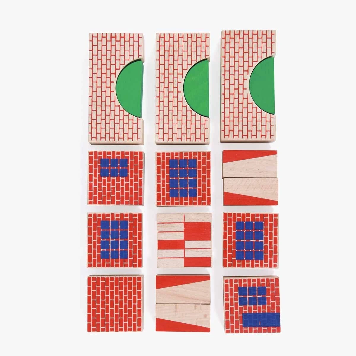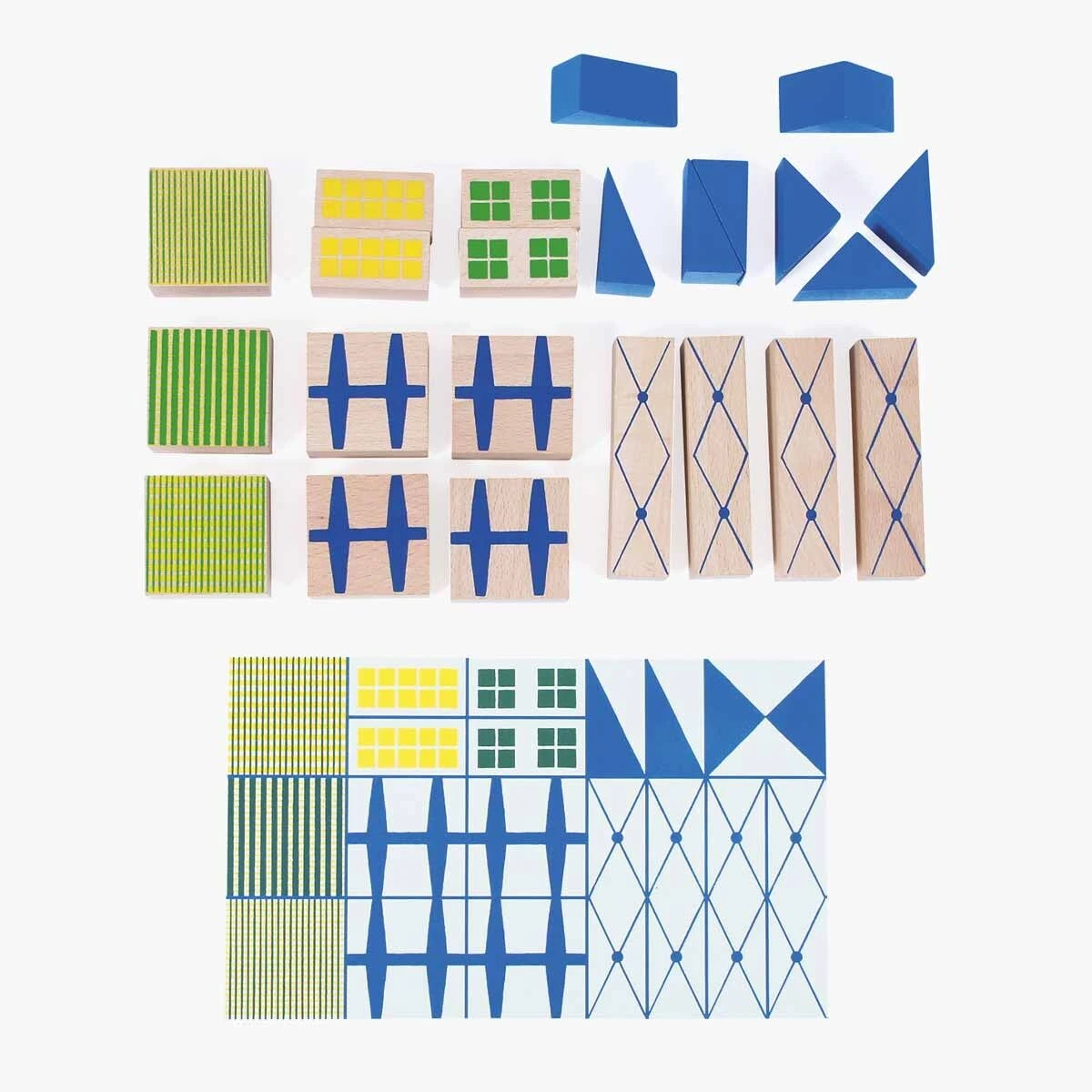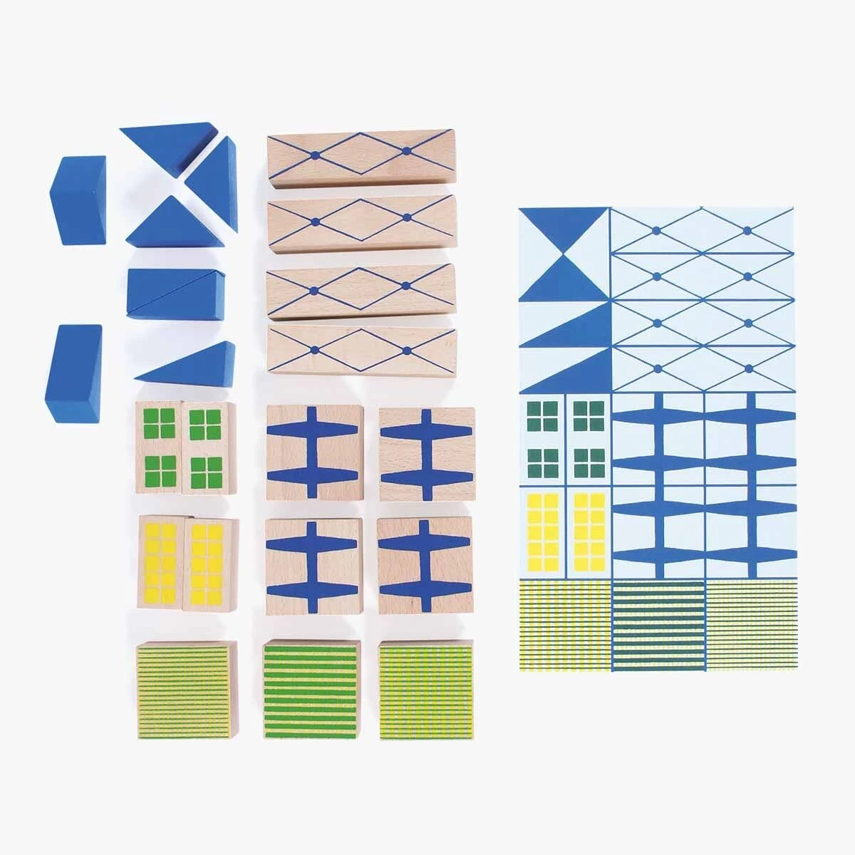 Jeu de manipulation et de construction, graphique, de 40 pièces en hêtre, sérigraphiées dans des couleurs primaires, pour inventer sa ville. Création d’Aurélien Débat qui permet à l’enfant de développer son imaginaire, les notions d’espace et de couleurs.