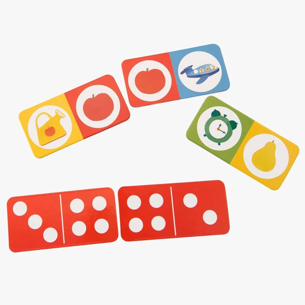 Jeu d’éveil en carton avec sur une face, les illustrations d’objets des Popipop en imagier, et sur l’autre face un jeu de dominos avec de gros poids blancs sur fond rouge. Un jeu pour observer et apprendre les chiffres, les couleurs et les formes.