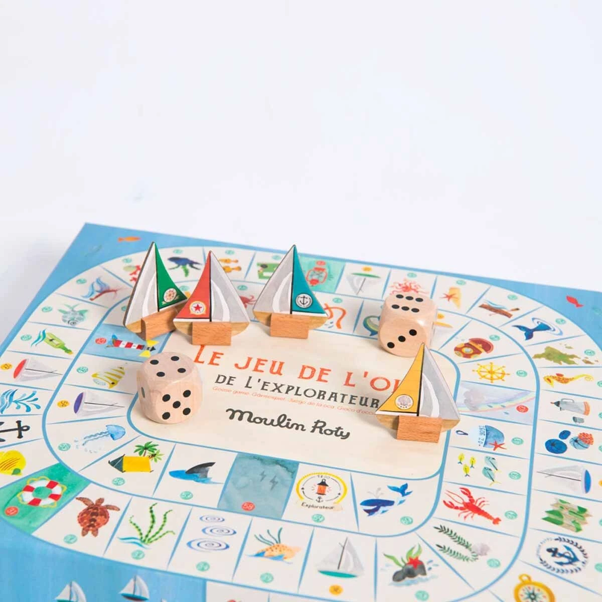 Un jeu de l’oie spécial explorateur où l’on croise de drôles de poissons et de dangereux tourbillons… Hissez les voiles, le premier arrivé sur l’île gagne le trésor ! Comprend 4 pions bateaux, 2 grands dés et un plateau illustré à l’aquarelle.