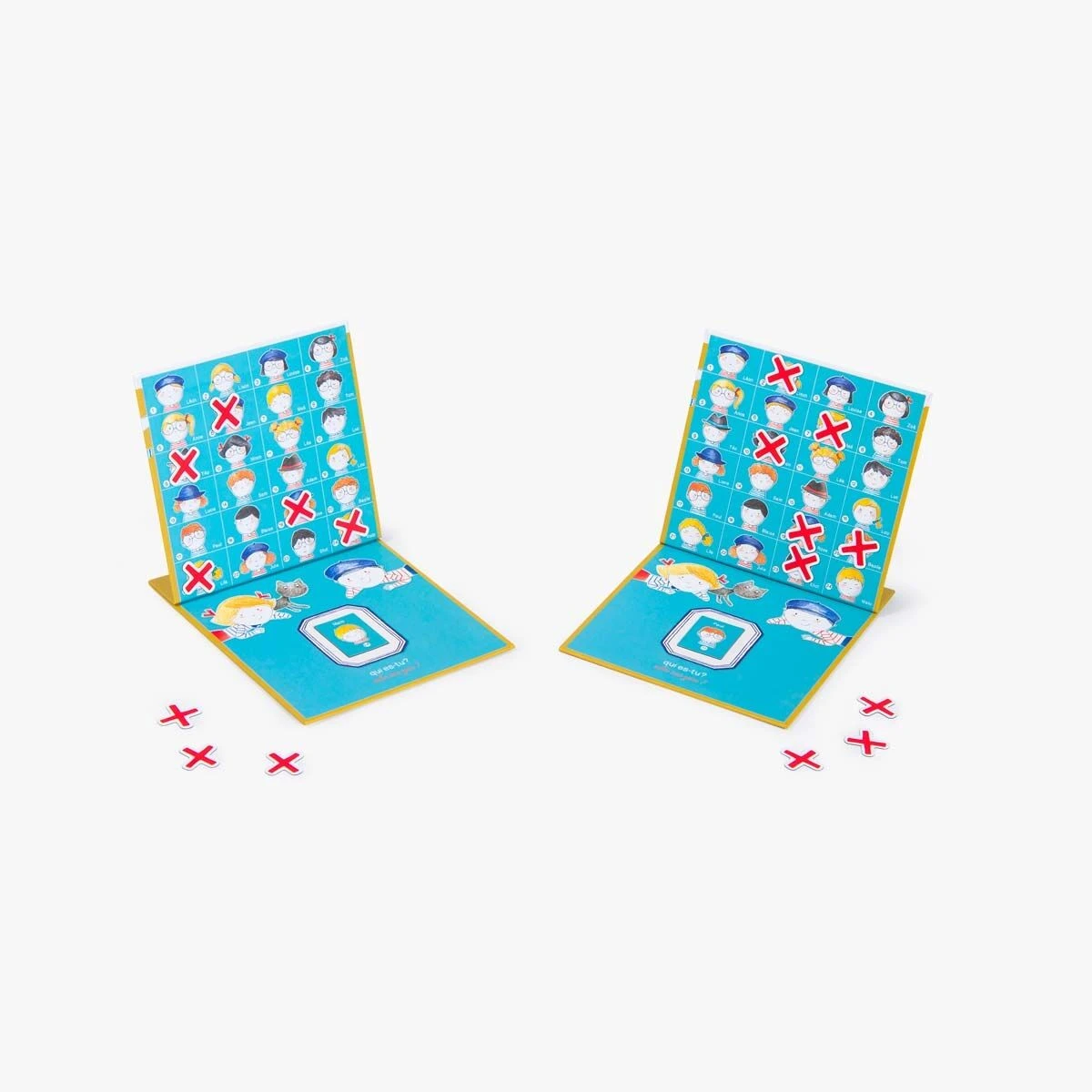 Qui es-tu ? Avec les magnets et les deux planches magnétiques illustrant plusieurs personnages, devine celui de ton partenaire en lui posant des questions sur son identité !