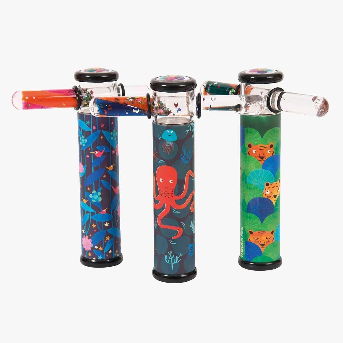 Kaléidoscope aux illustrations naïves et colorées oiseaux et végétaux avec à son extrémité un tube coulissant contenant du gel et des paillettes qui, associé aux petits miroirs du kaléidoscope, démultiplie à l’infini les combinaisons de formes et de couleurs.