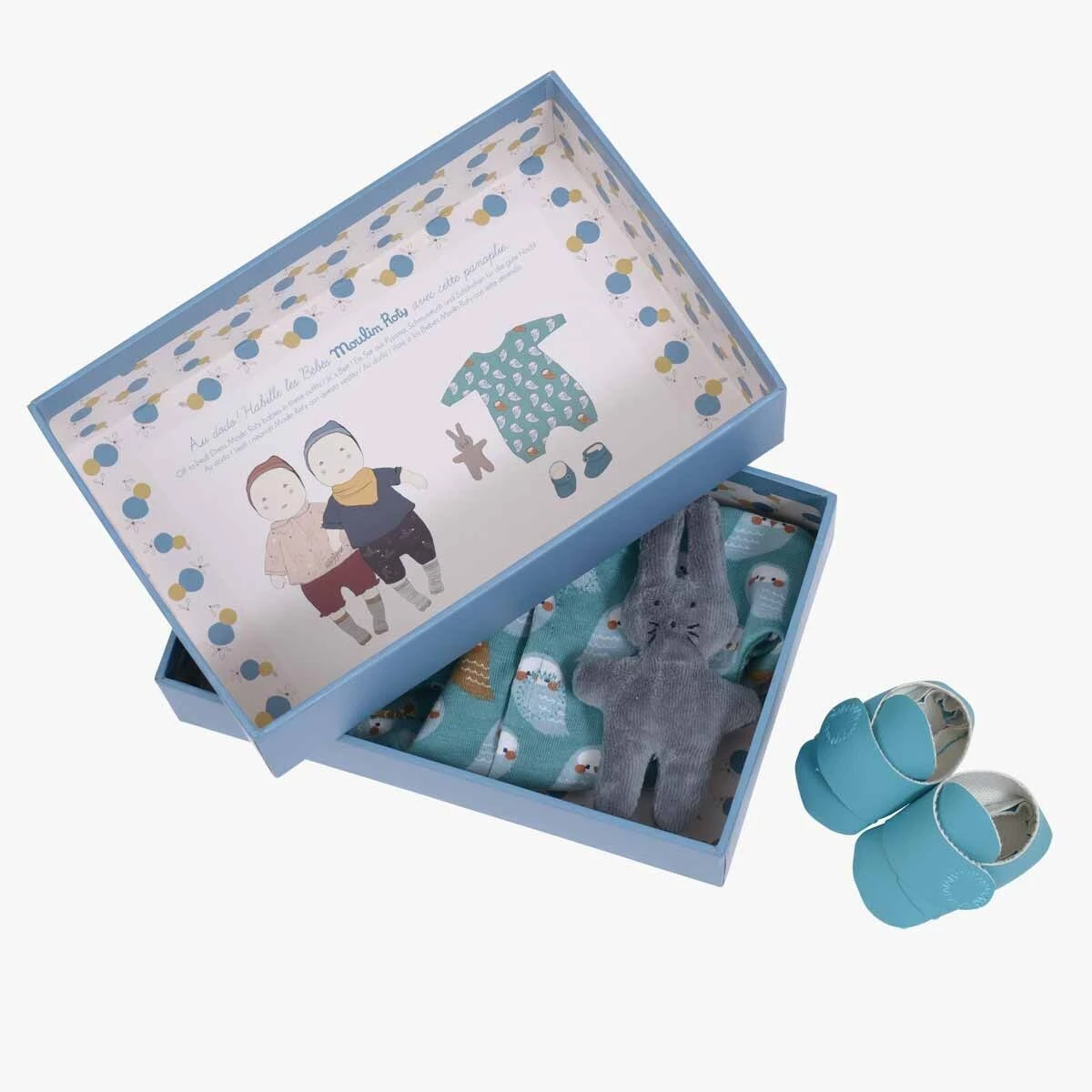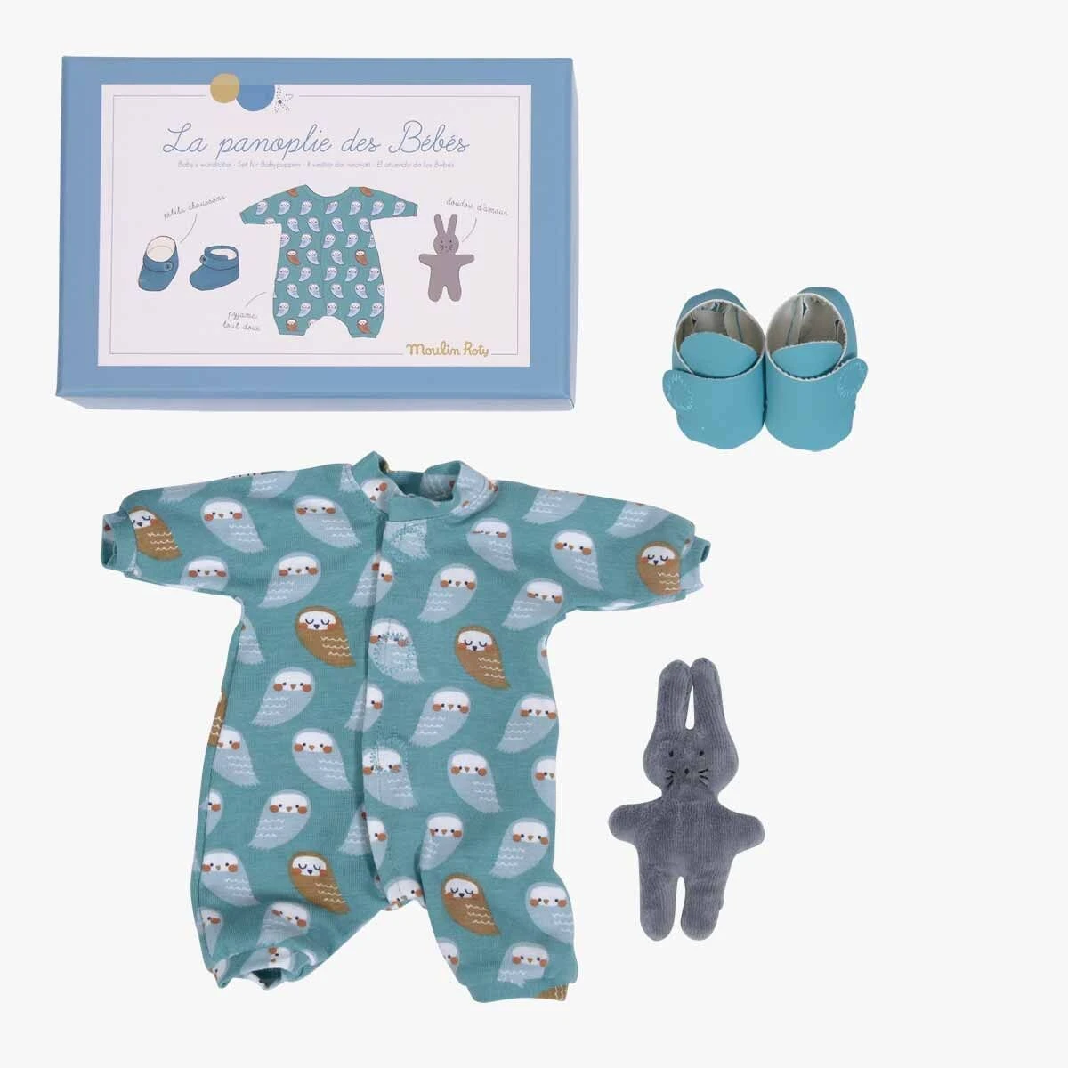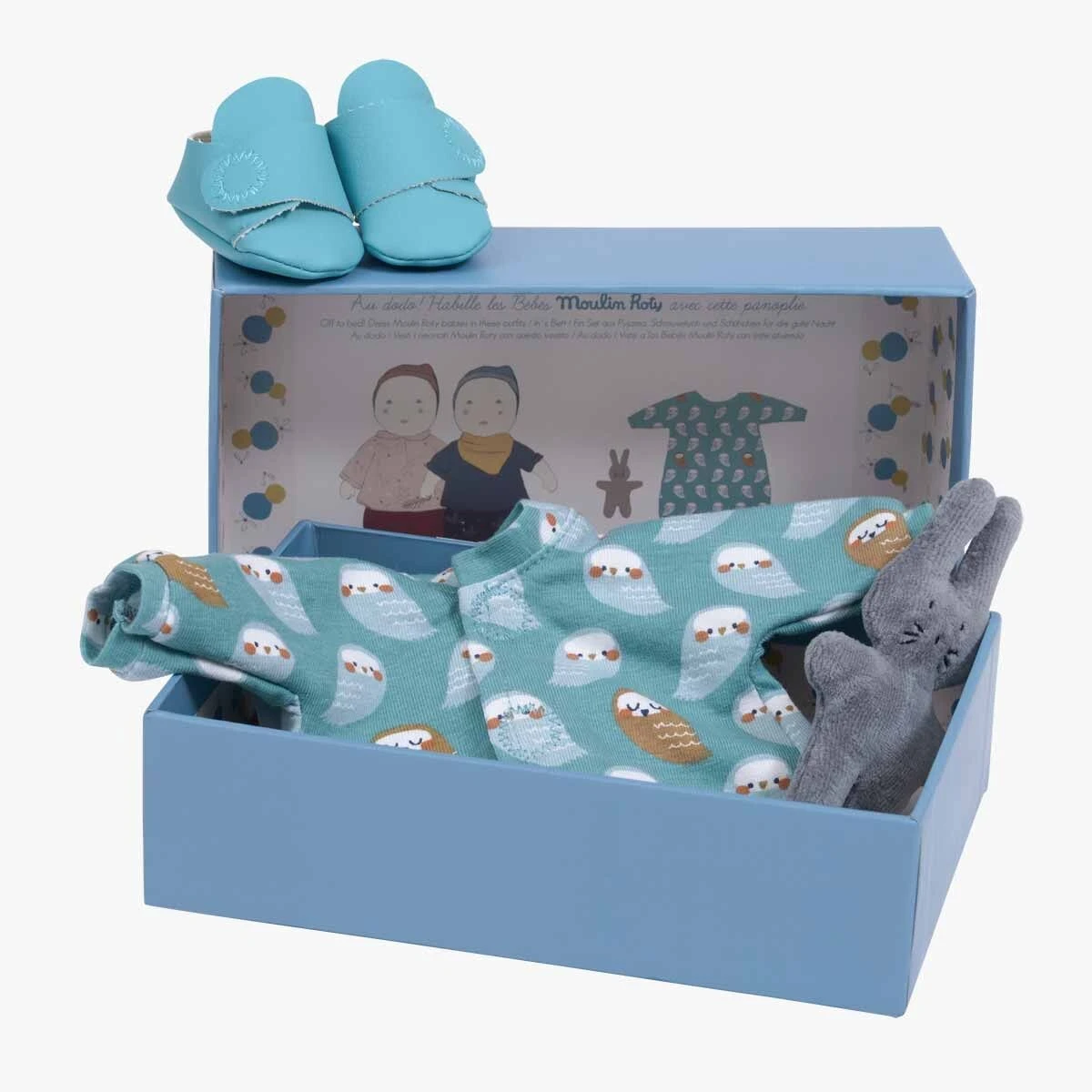 Chut… Nos deux bébés vont se coucher. Il est l’heure de sortir la parfaite panoplie pour le dodo : un pyjama en coton avec son adorable motif hibou, des chaussons en simili cuir turquoise, et bien sûr, un doudou lapin en velours tout doux.