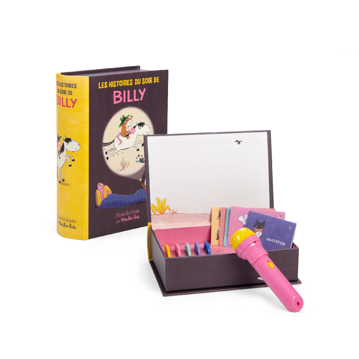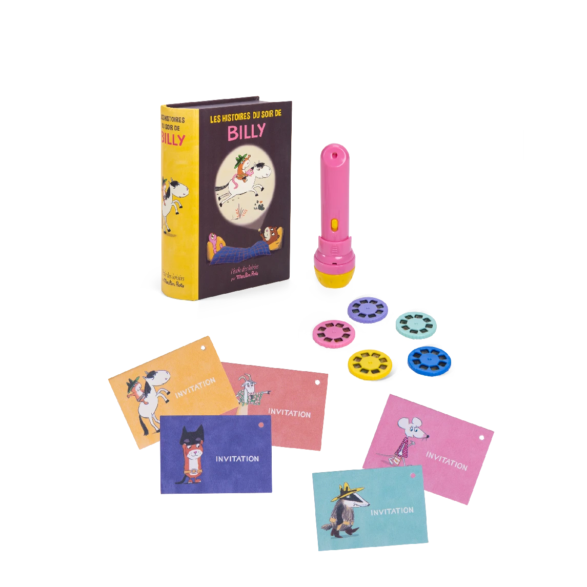 Coffret illustré, conçu comme un livre magique avec une lampe à projeter, 5 disques et 5 invitations. Chaque disque, projeté dans le livre ou sur un mur, raconte une histoire de Billy le hamster et son ami Jean-Claude de l’école des loisirs.