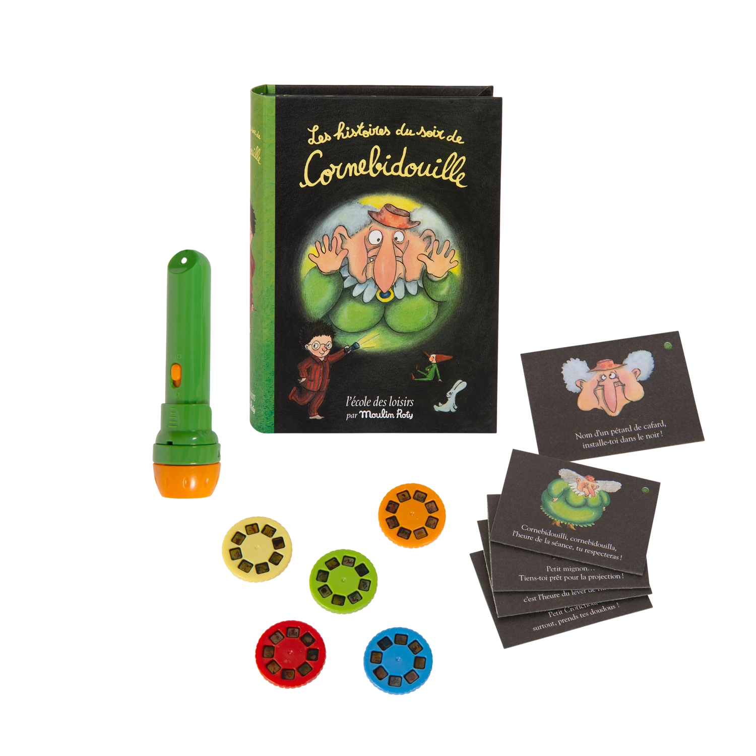 Ravissant coffret aimanté, joliment illustré, conçu comme un livre comprenant : une lampe à projeter, 5 disques et 5 invitations. Chaque disque, projeté sur le mur, raconte une histoire de Cornebidouille la sorcière de l’école des loisirs.