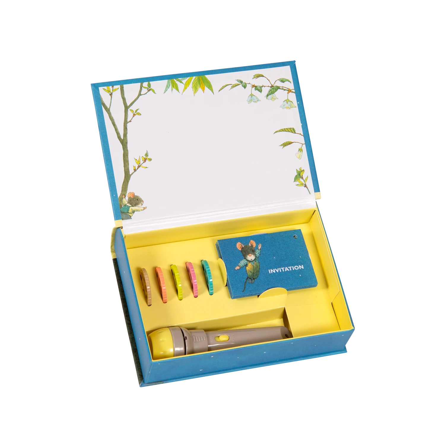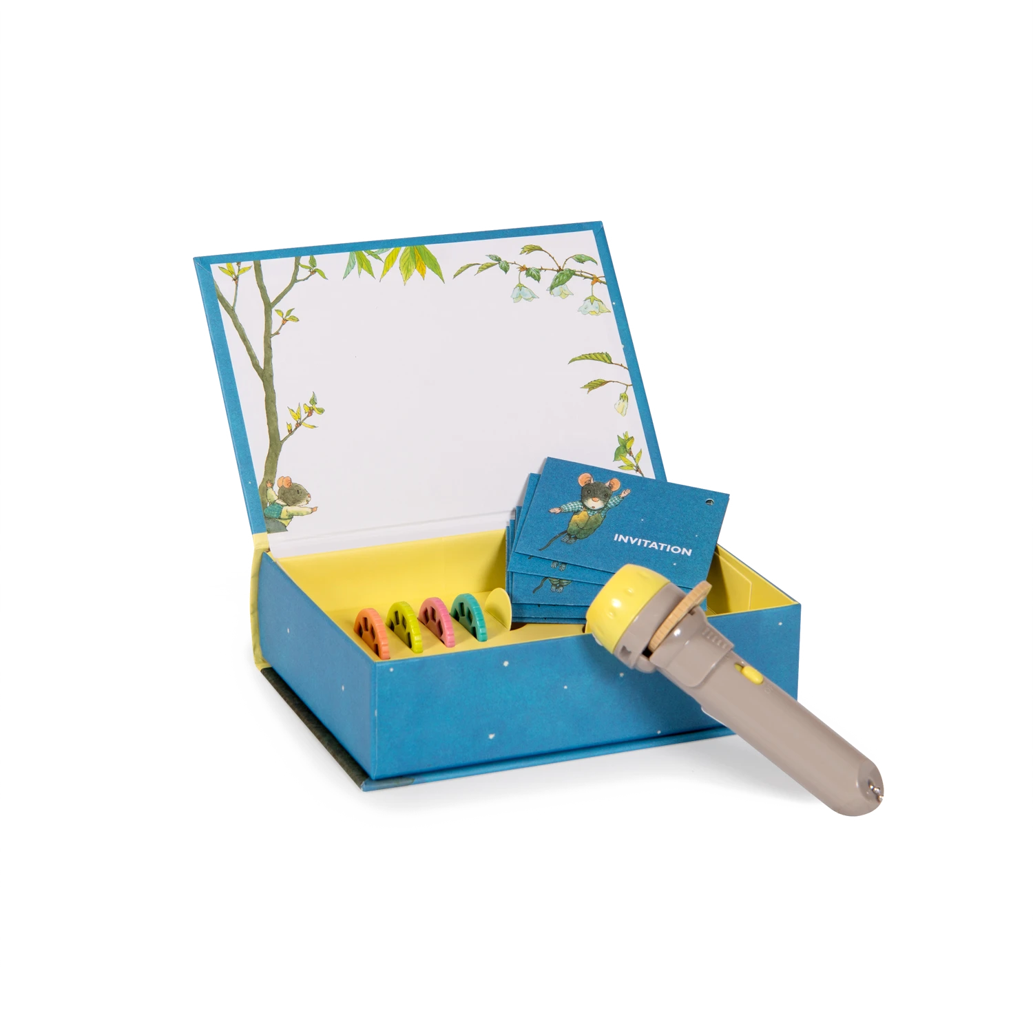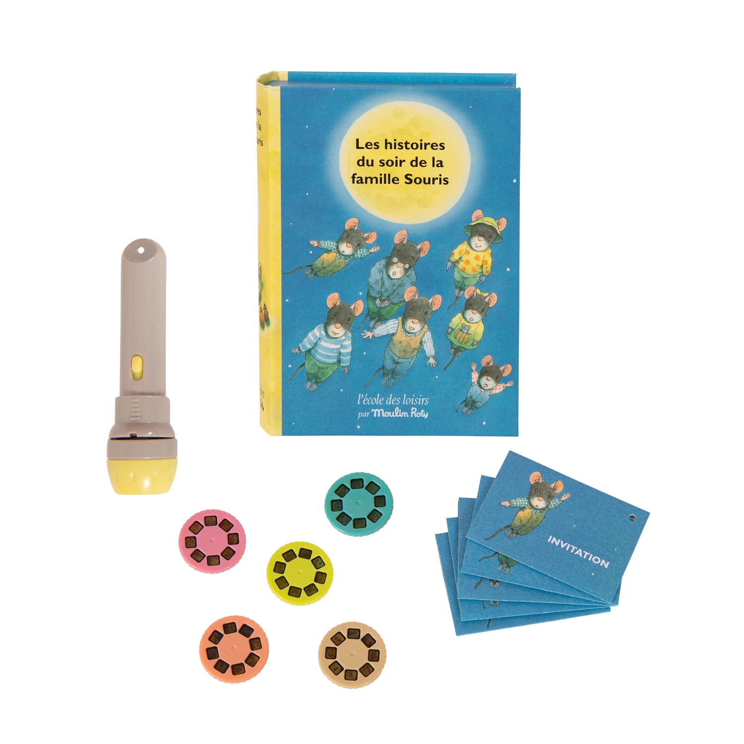 Ravissant coffret aimanté, joliment illustré, conçu comme un livre comprenant : une lampe à projeter, 5 disques et 5 invitations. Chaque disque, projeté sur le mur, raconte une histoire sur la famille Souris, classique de l’école des loisirs.
