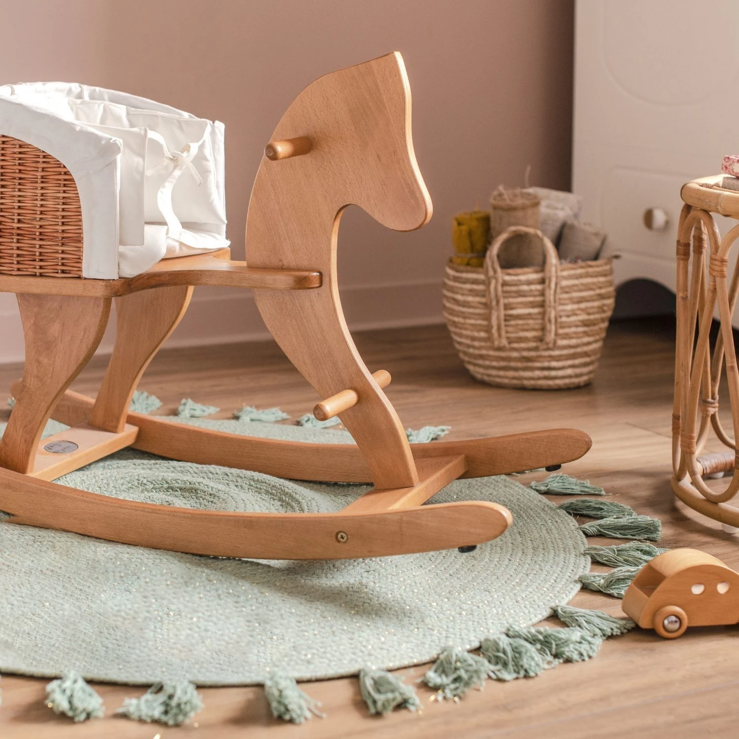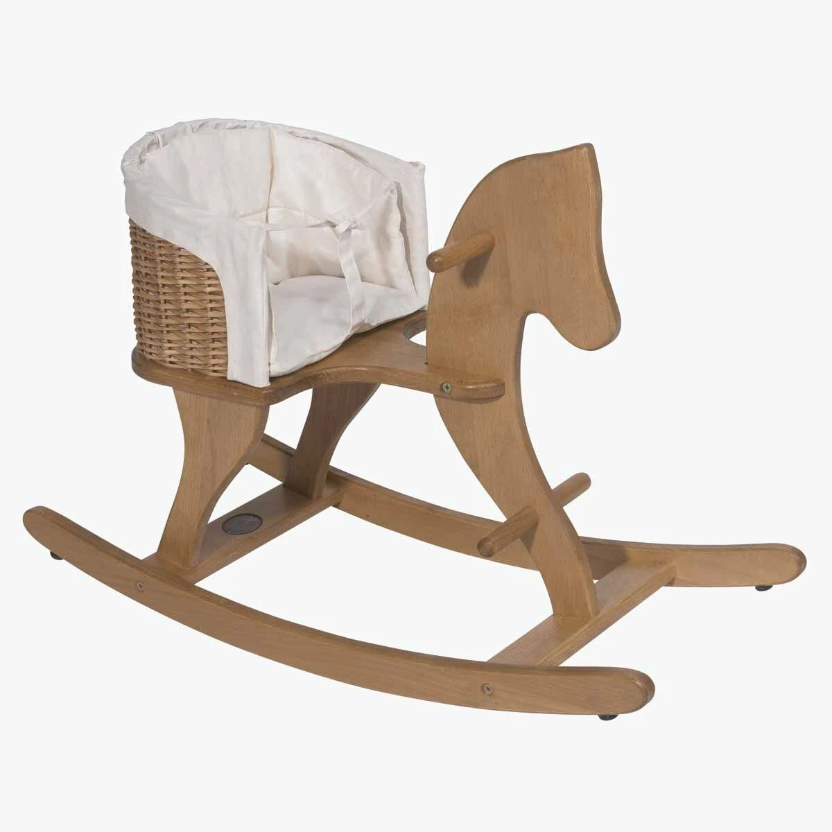 Cheval à bascule, intemporel et authentique, en hêtre massif verni, avec assise confortable en toile et osier.