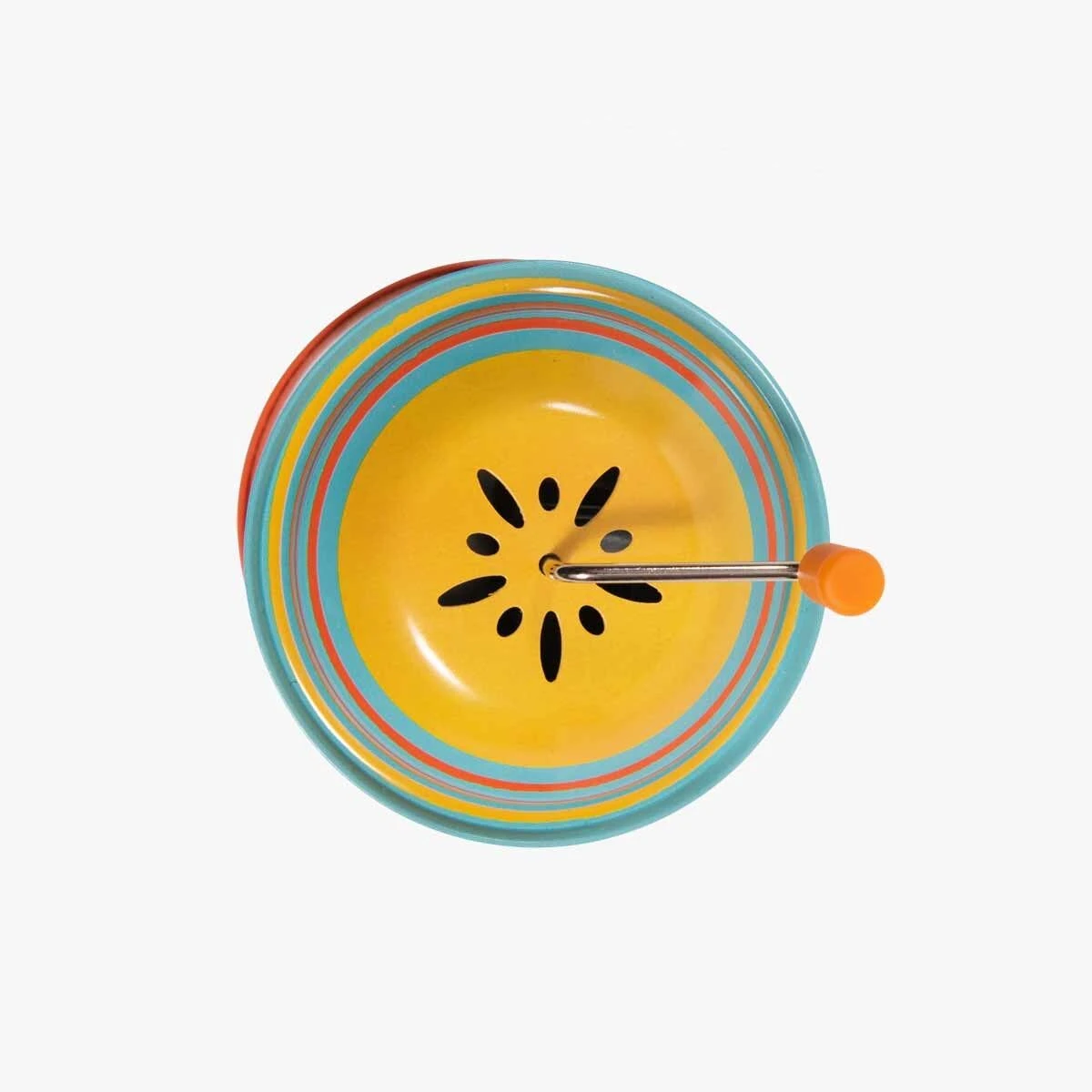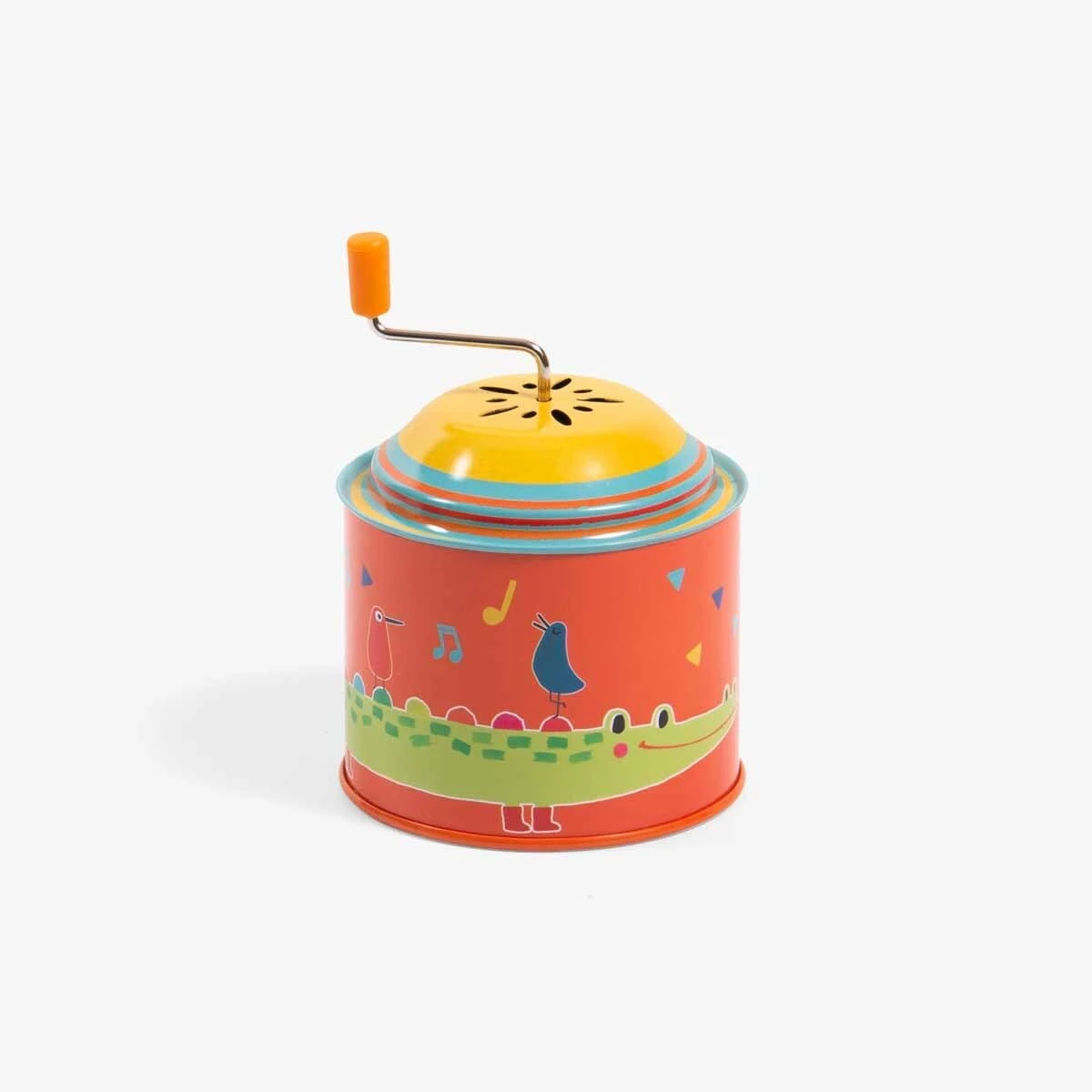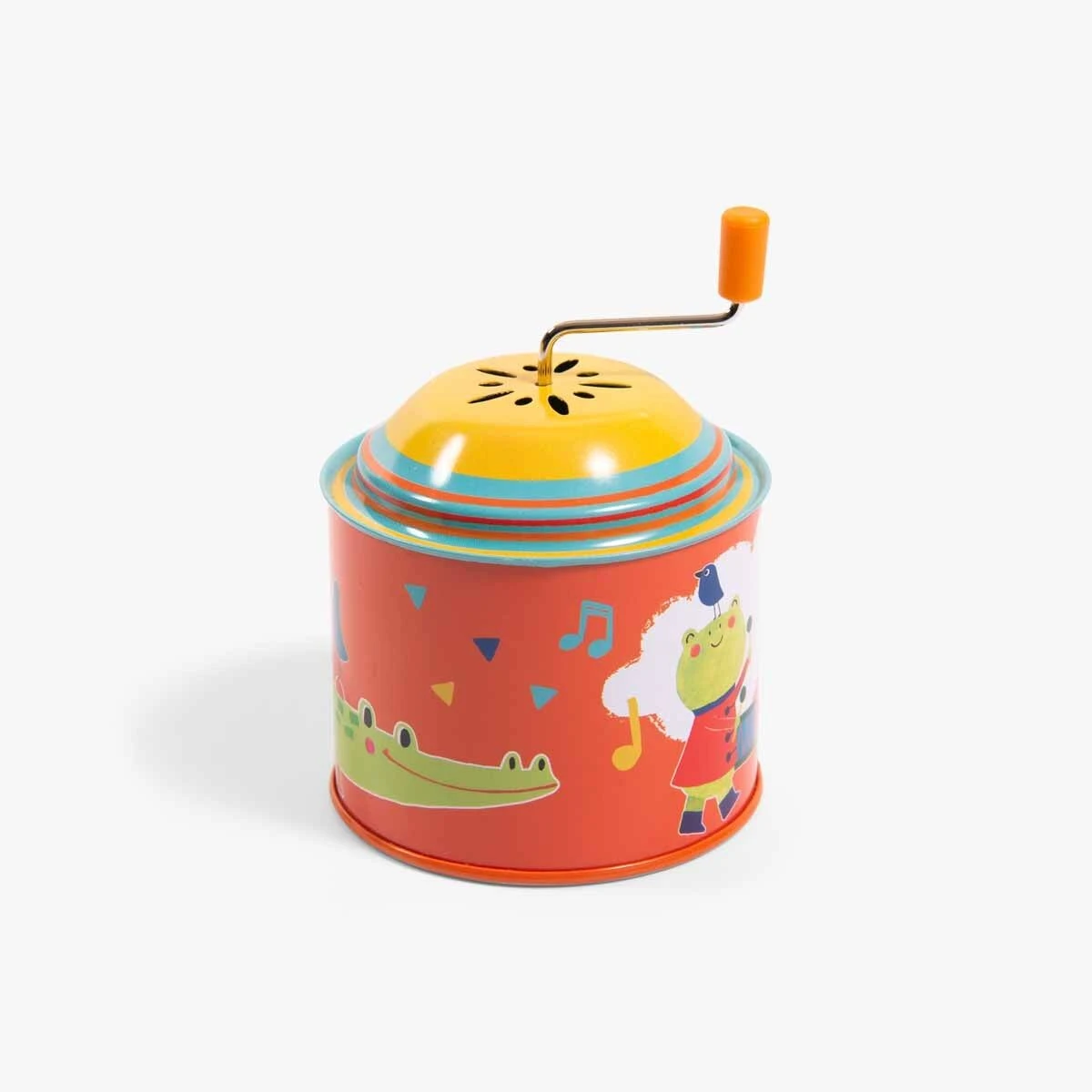 Tourne, tourne et en avant la musique ! Clin d’œil aux jouets qui ont accompagné notre enfance, ce moulin à musique en métal est vif et coloré, illustré sur le thème de la fanfare avec une grenouille musicienne et un crocodile géant !