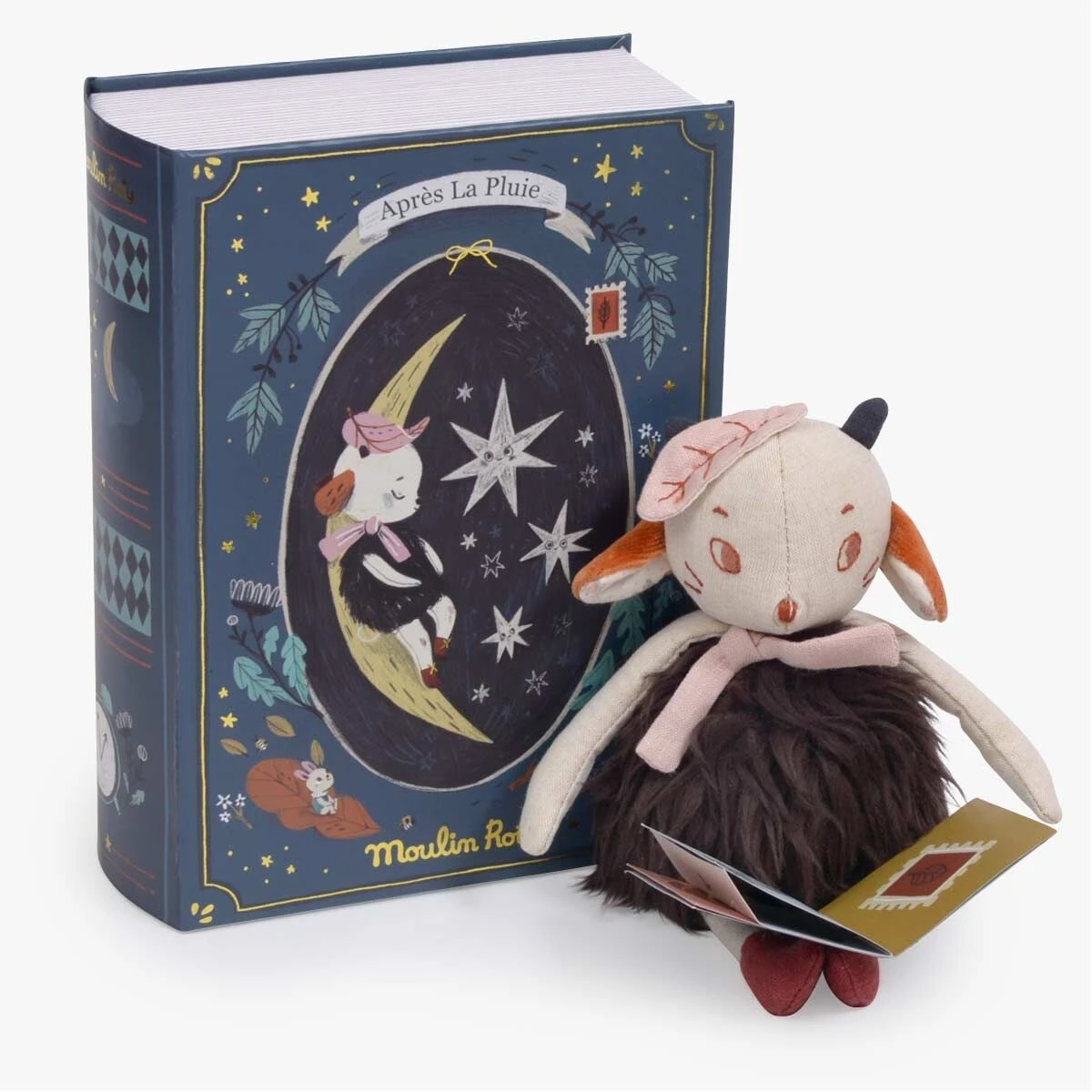 Dans sa boîte illustrée par Lucille Michieli, le mouton Réglisse en fourrure et tissu chambray est blotti sous sa couverture à pois, entre son matelas en lange et son coussin nuage. Il tient dans ses bras un mini-livre pour raconter de jolies histoires…