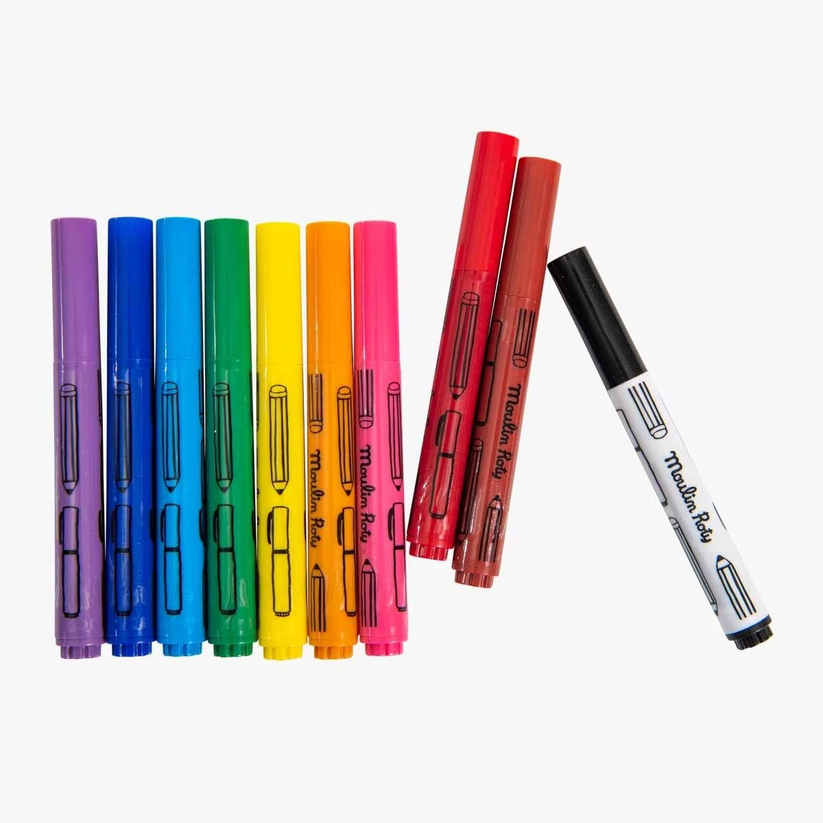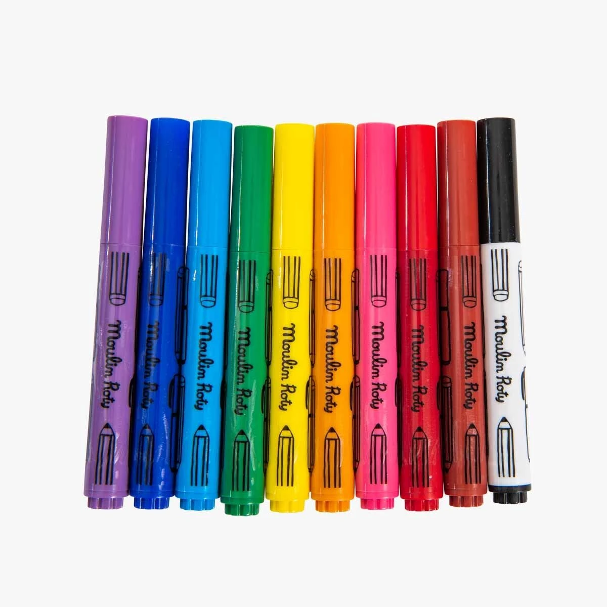Dix gros feutres de couleur, avec une pointe arrondie qui ne s’enfonce pas ! Lavables, ils seront vite adoptés par les petits pour réaliser leurs premiers dessins.