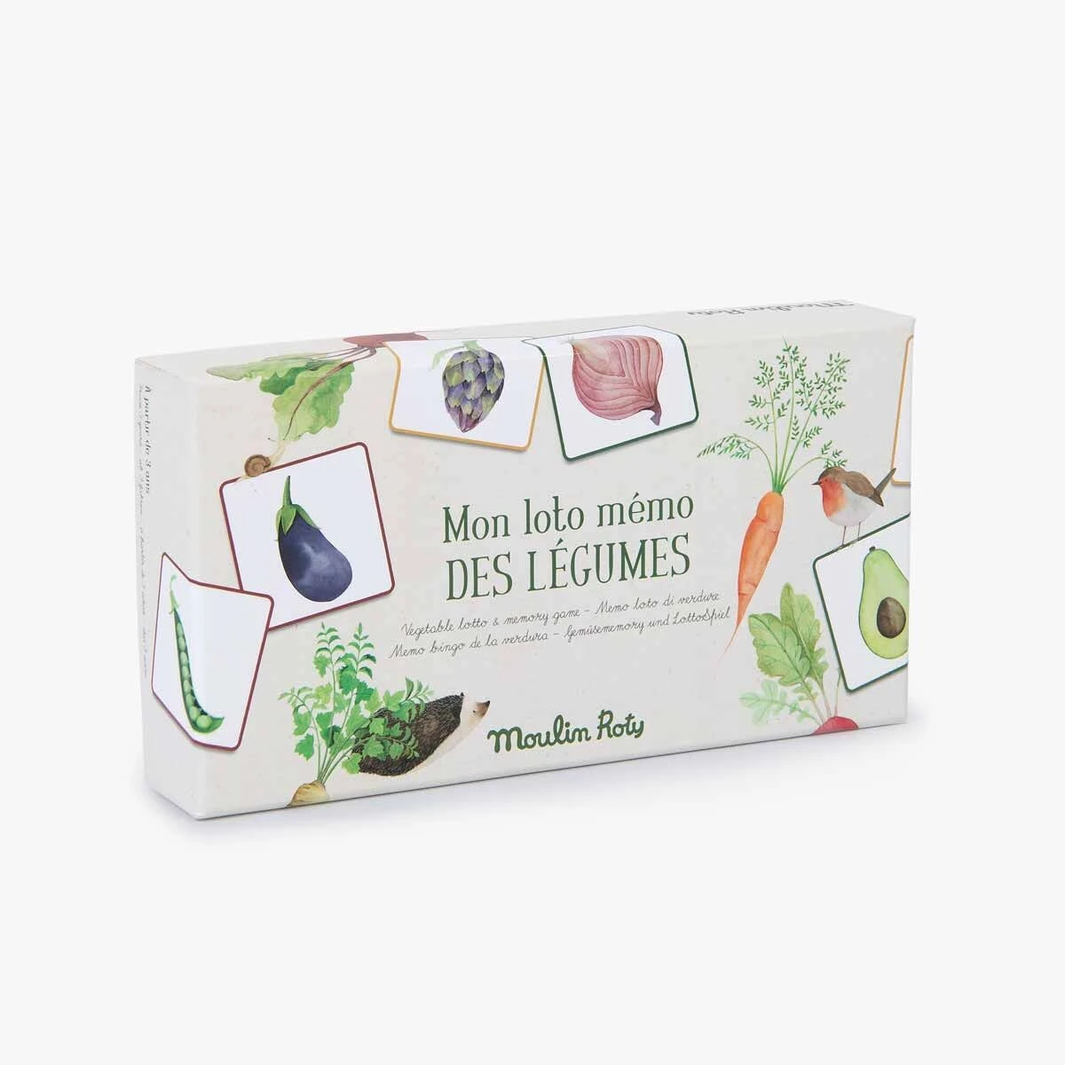 Un jeu 2-en-1 avec 6 planches et 36 cartes illustrées pour jouer au mémo… ou au loto ! Les enfants s’amuseront à reconnaître les légumes dehors ou sous terre, entiers ou coupés en deux, grâce aux fines illustrations à l’aquarelle.
