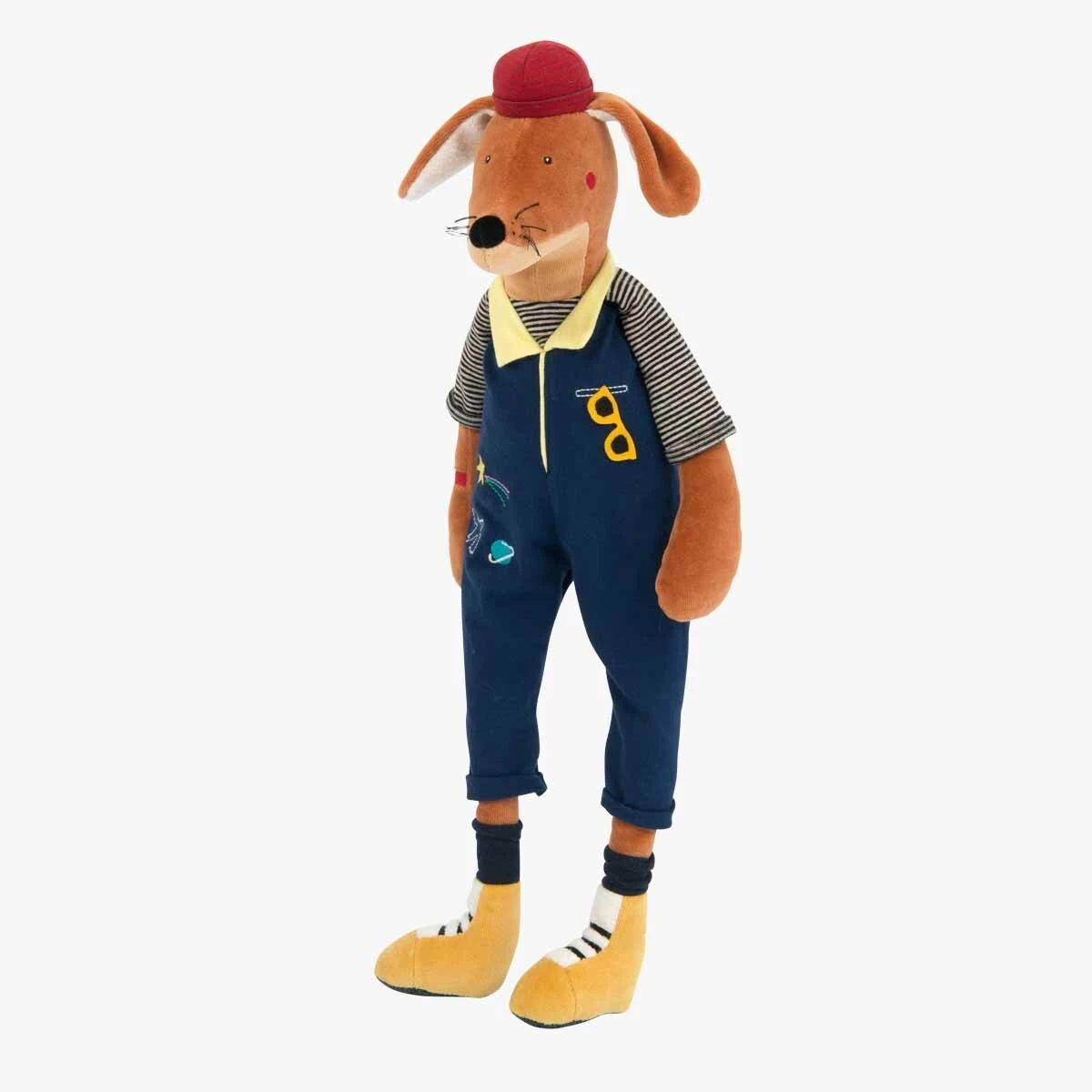 Elvis le chien enfile sa salopette décontractée et son bonnet rayé pour se rendre à son cours de dessin. Toujours cool, ce fan des 90’s est le compagnon looké qui plaira aux petits et aux grands, pour jouer… ou décorer !