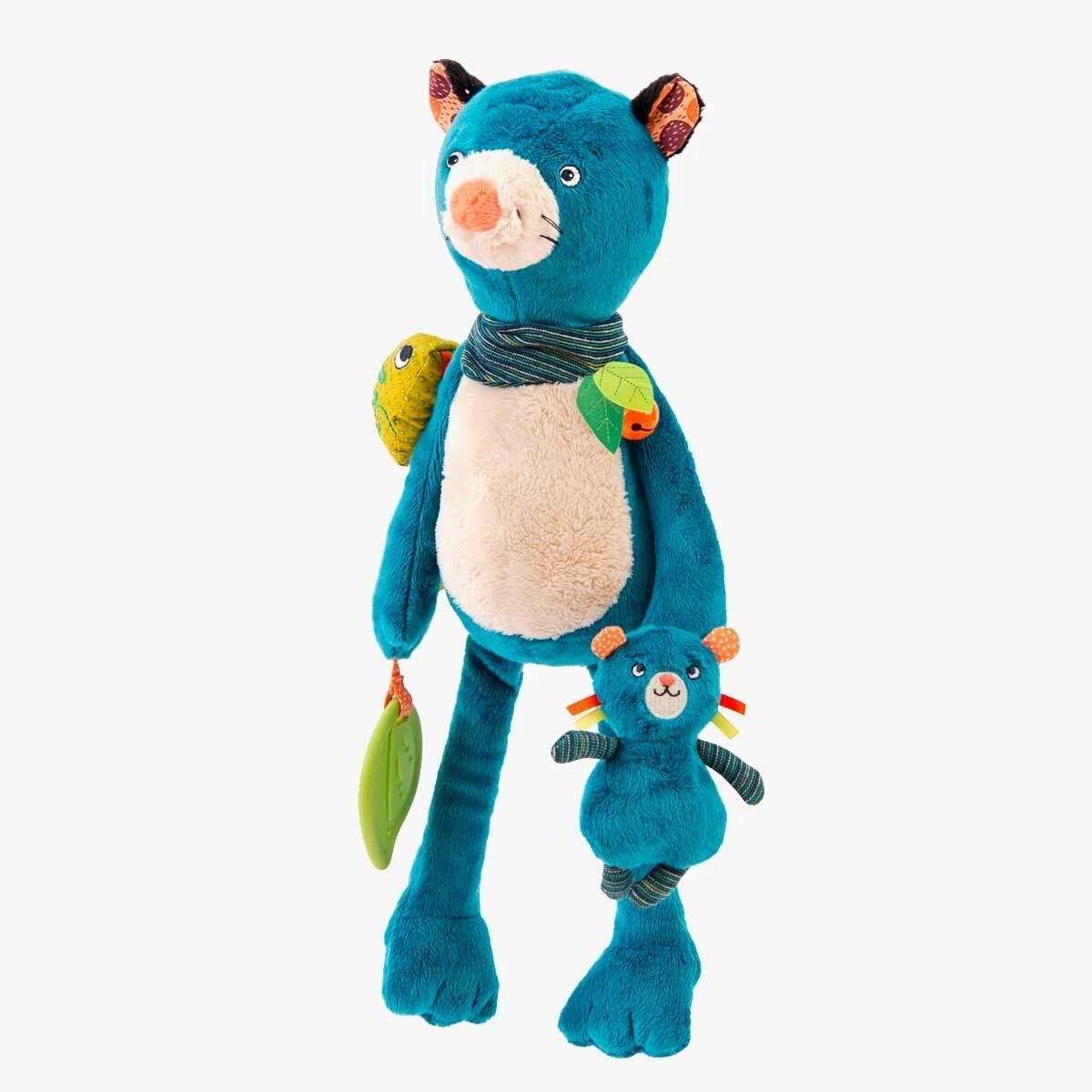 Panthère d’activités avec, dans sa poche ventrale, son tout-petit et leur ami caméléon sur son bras. Jeu de textures et d’accessoires pour offrir à bébé un moment de jeu et de découverte : hochet, anneaux, spatule dentaire, grelot…