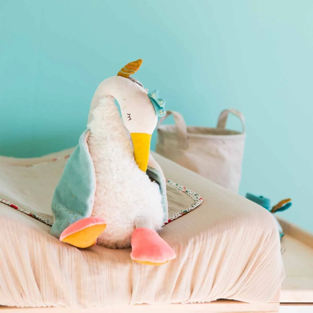 Poupée musicale avec une languette qui se trouve sous l’oie Olga et son pelage en éponge velours gris et fourrure crème, laissez bébé s’apaiser et s’endormir sur la douce mélodie…