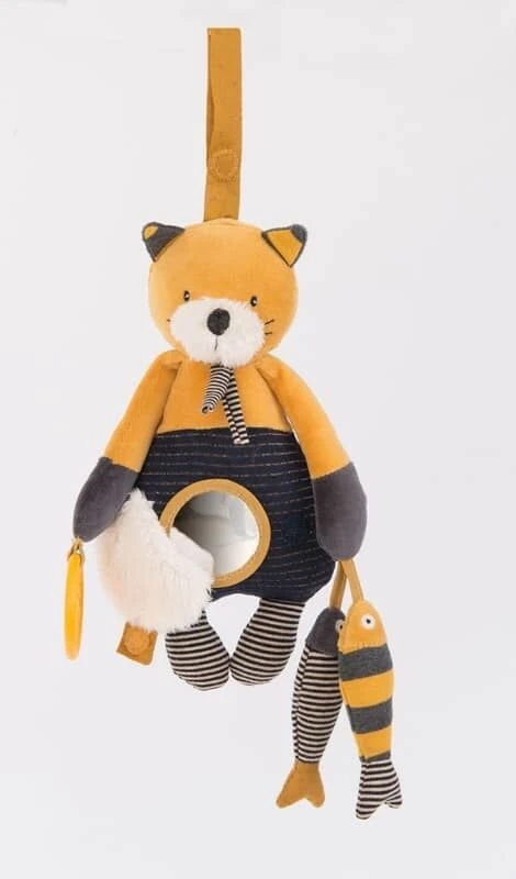 Lulu le chat a tout ce qu’il faut pour amuser bébé ! Il transporte une spatule dentaire, des sardines avec papier crissant et surprise… un miroir caché dans sa combinaison ! Il s’accroche partout grâce à son lien, et fait gling-gling quand on le secoue !
