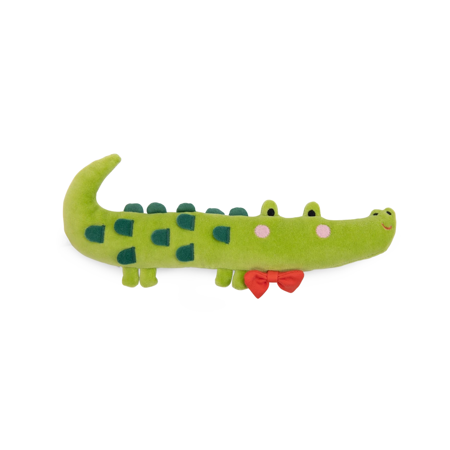 Petit croco couvert d’écailles en velours vert tout doux qui porte son plus beau nœud autour du cou ! Tout sourire et facile à saisir, il sera le compagnon préféré de bébé. Dans son ventre se cachent de petites billes qui font du bruit quand on l’agite.