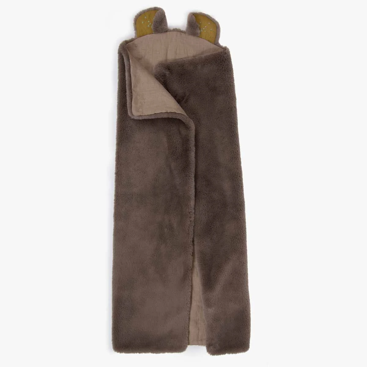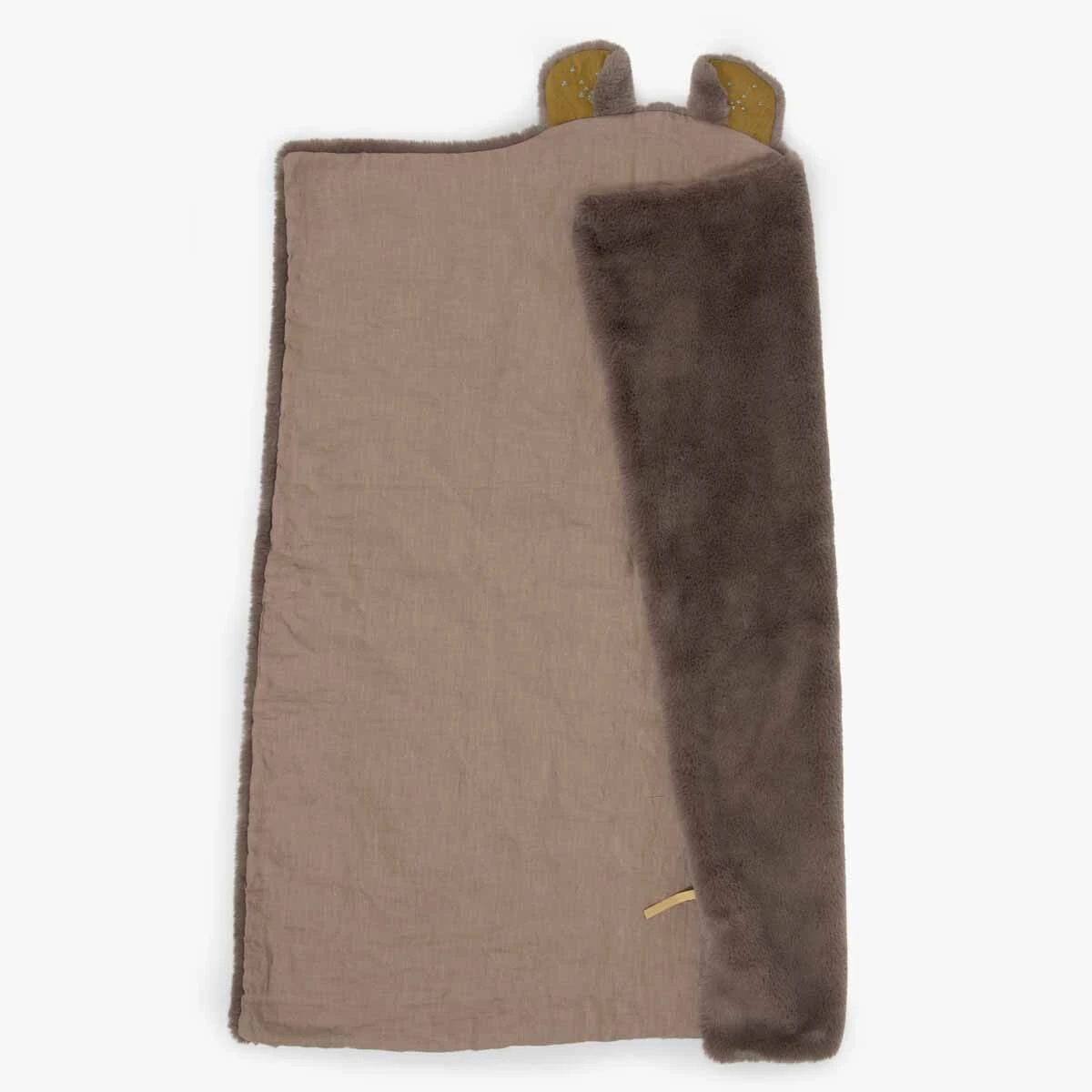Plaid gris avec deux adorables oreilles d’ours brodées à l’intérieur ! Comprend un côté en lin naturel et un côté en fourrure toute douce… Idéal pour les sorties de bébé dans la poussette, ou s’emmitoufler dans le canapé, à nimporte quel âge…