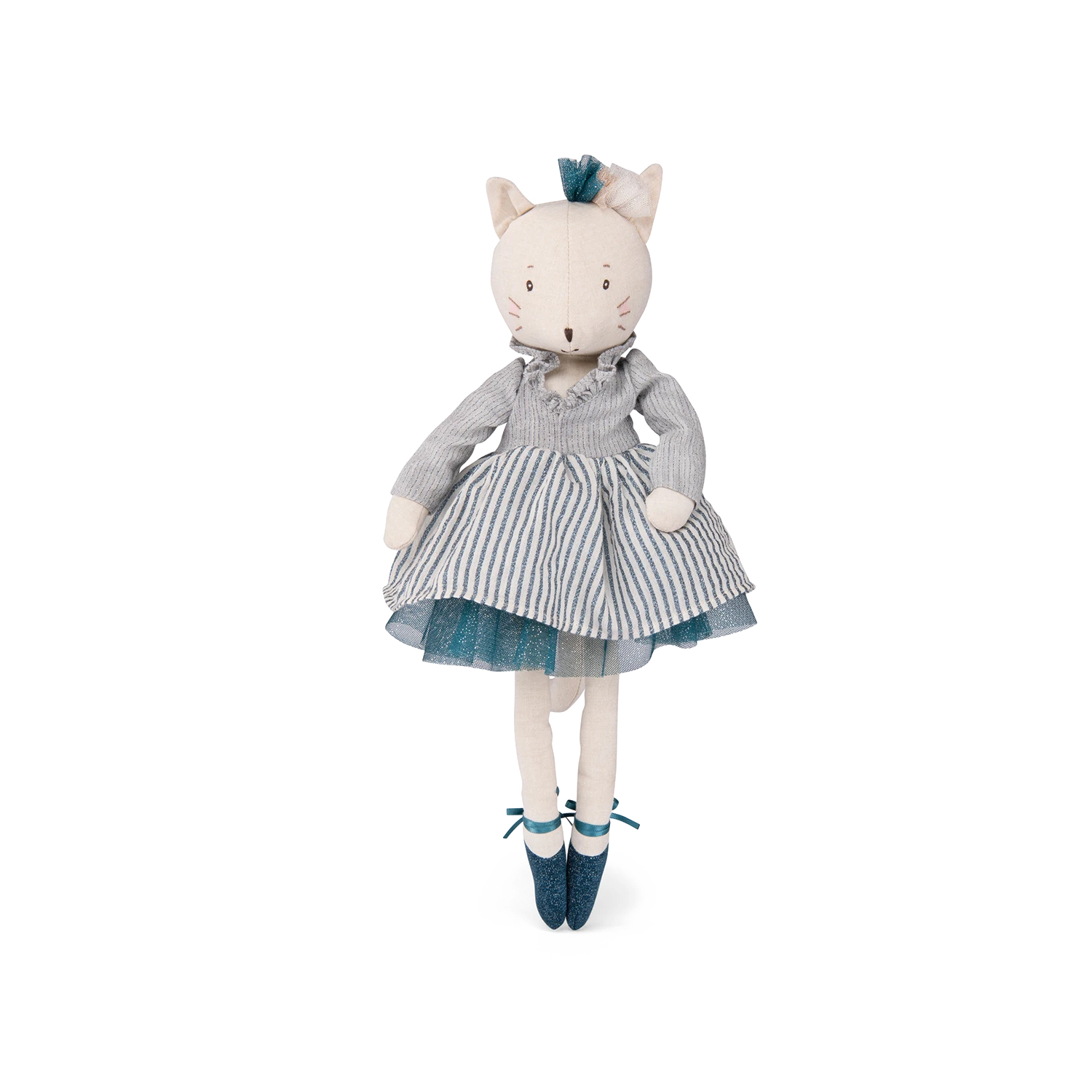 Poupée chat en chambray au doux visage brodé, Célestine arbore la panoplie de la danseuse : tutu, coiffe en tulle, chaussons à rubans… Facile à attraper par les petites mains, elle deviendra le compagnon de jeu privilégié des petits danseurs en herbe.