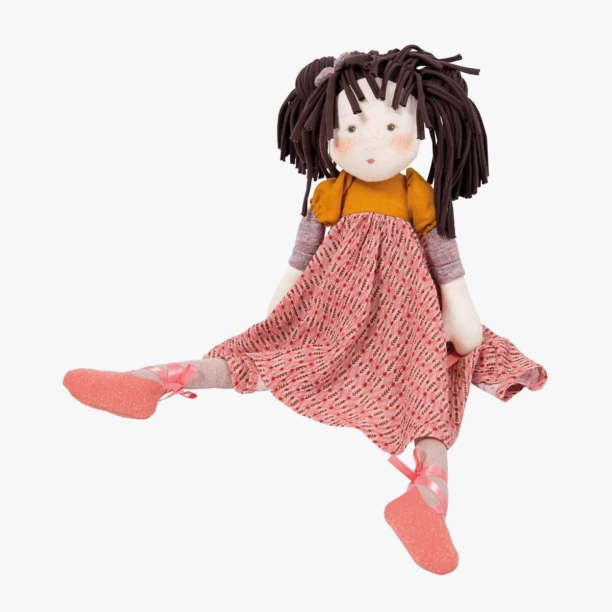 Pour le jeu et la déco : poupée de chiffon Prunelle, au doux visage illustré et imprimé, avec de longs cheveux bruns en jersey rouleauté. Elle est chaussée de babies pailletées avec rubans de satin et vêtue d’une robe légère et ample aux motifs champêtres