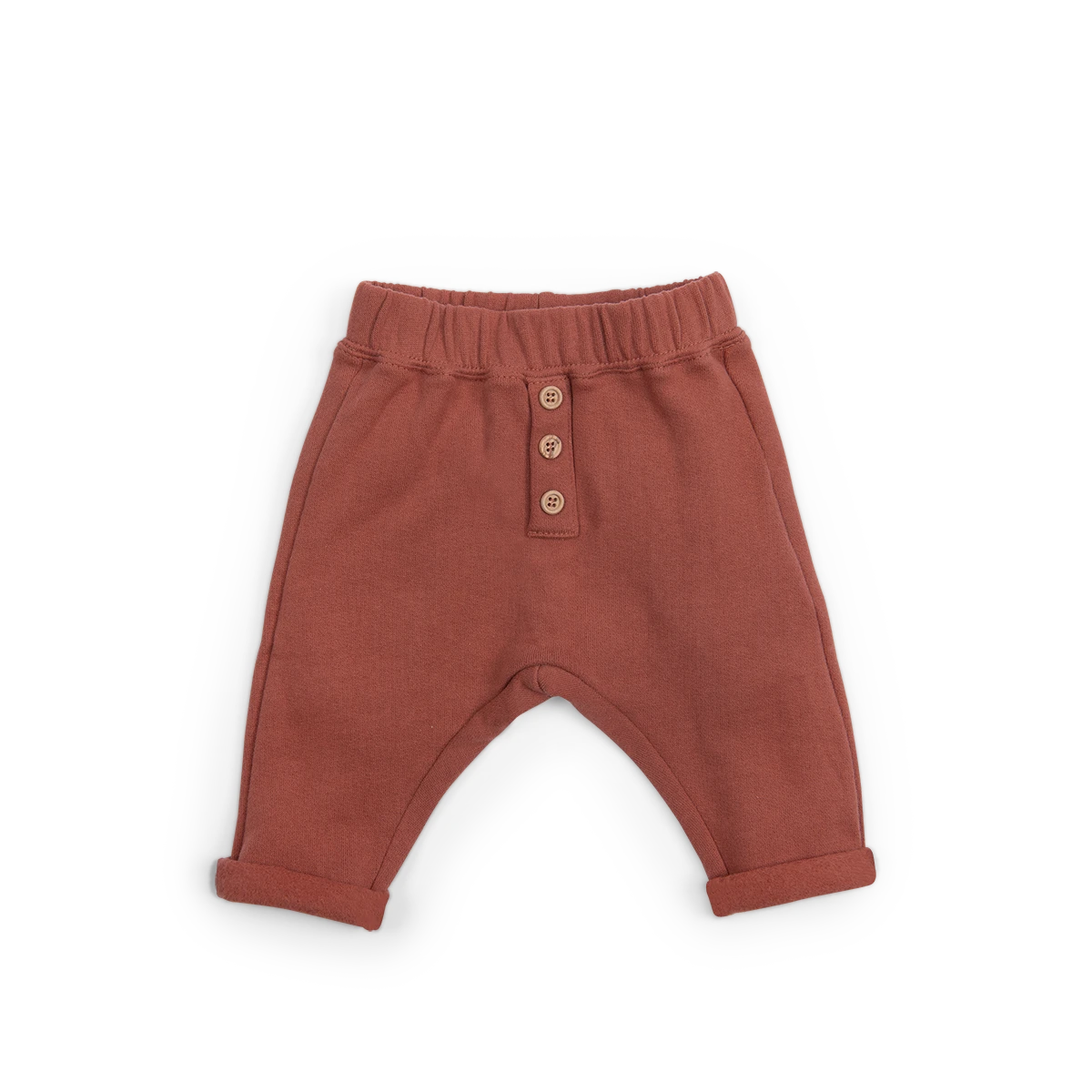 Sarouel cannelle en molleton gratté 100% coton. Boutonnière en trompe l’œil pour un look plus sophistiqué. Elastiqué à la taille.