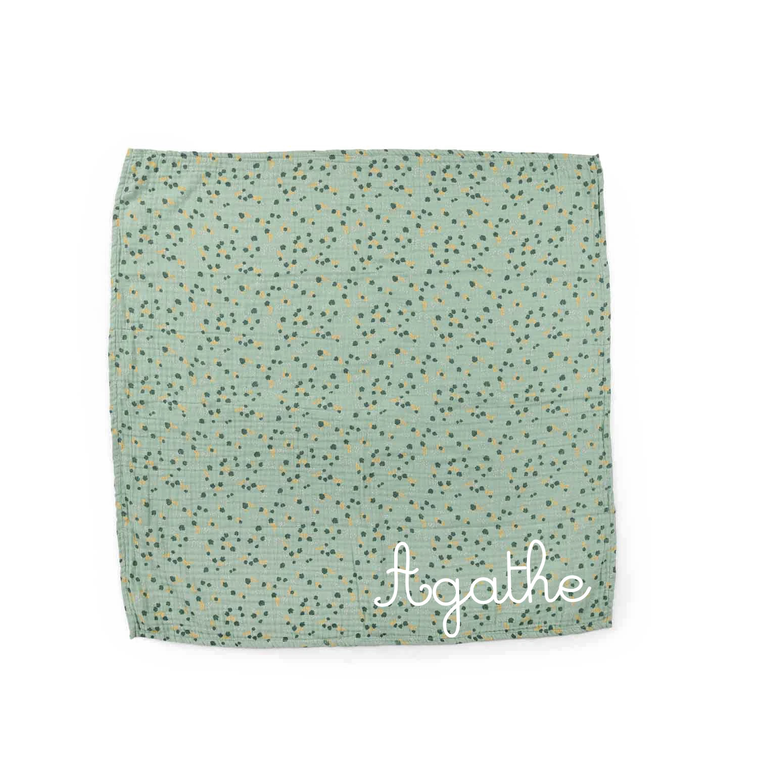 Set de 3 langes imprimés (sauge/argile/ocre) en coton bio, certifié OEKO-TEX® pour les soins quotidiens de bébé (couverture, bavoir, emmaillotage, change…). Un des 3 langes (couleur sauge) est personnalisable avec une broderie.