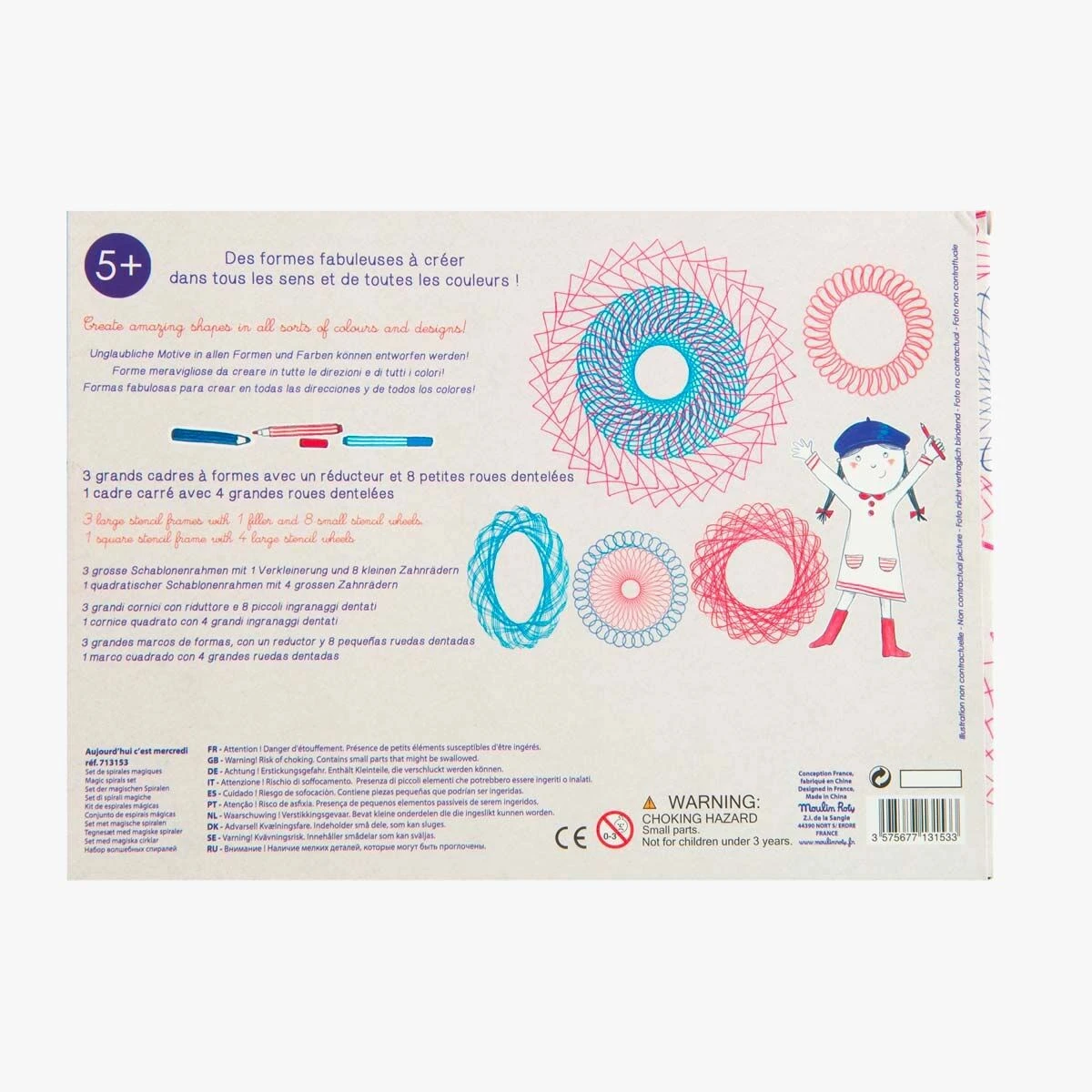 Un set complet de grands cadres et petites roues dentelées pour créer des formes fabuleuses dans tous les sens, et de toutes les couleurs ! A utiliser avec des crayons feutres ou crayons de couleur.