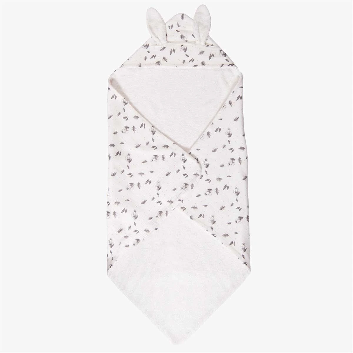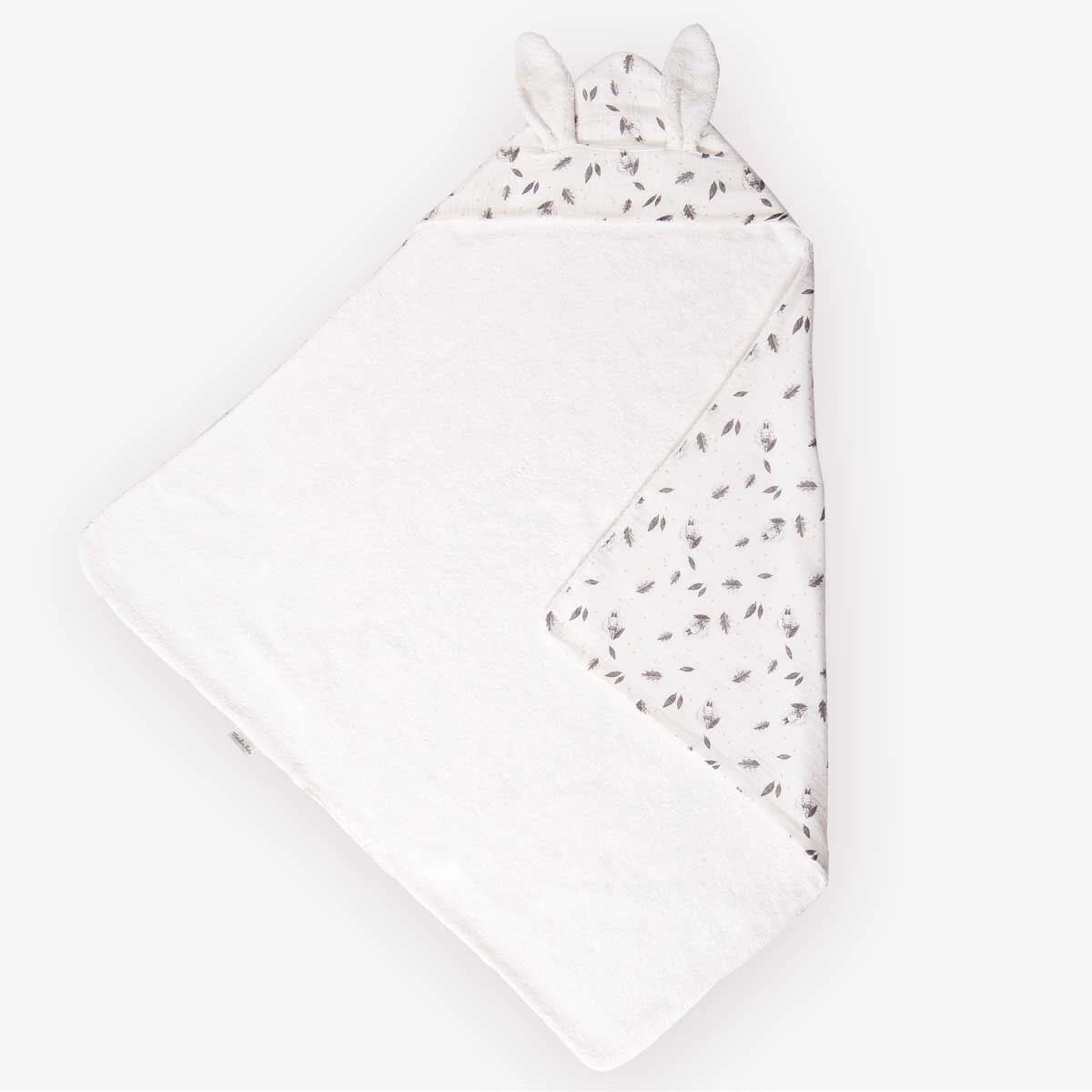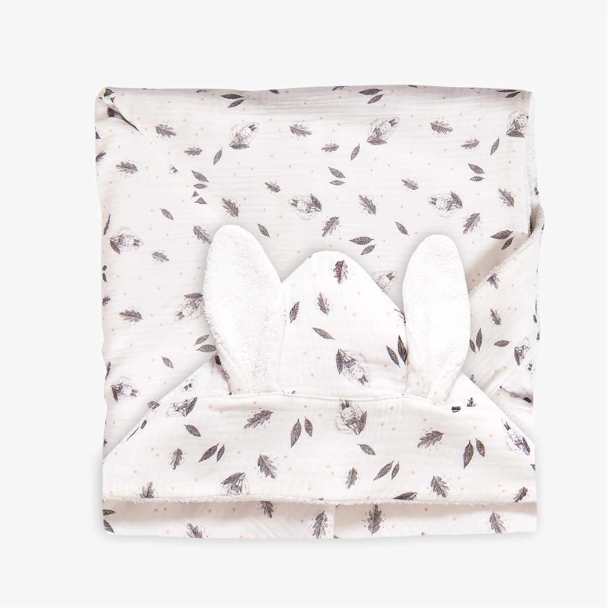 Cape de sortie de bain 100% coton en matière éponge bouclette et lange à motifs. La capuche est surmontée de deux adorables oreilles de lapin. Elle peut être brodée au prénom de l’enfant, idéal pour un cadeau naissance !