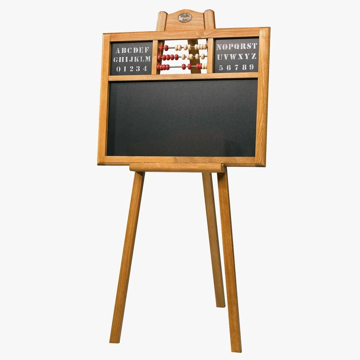 Tableau d’écolier intemporel et authentique, en hêtre massif verni avec boulier et alphabet.