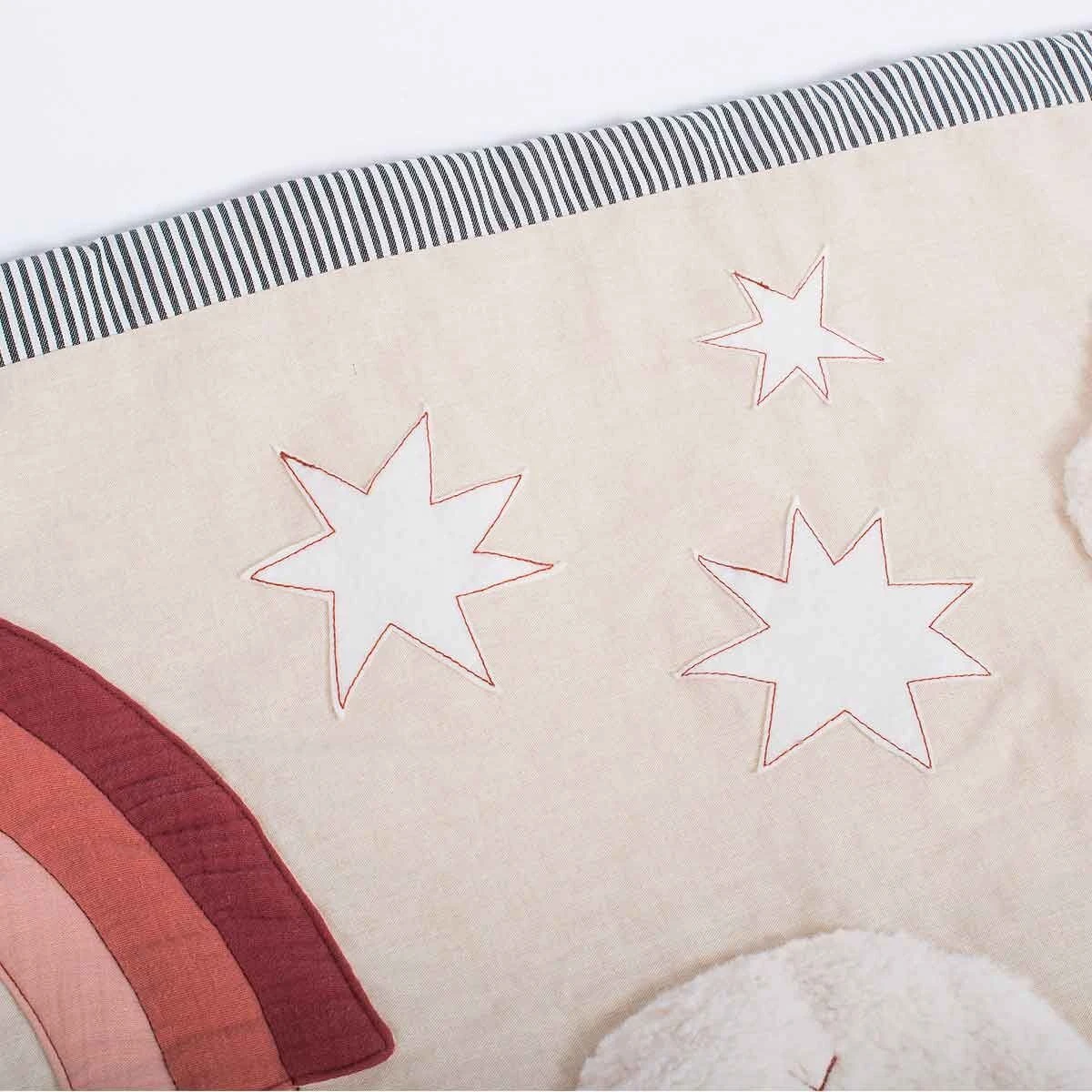 Tapis molletonné en tissu chambray avec de nombreuses activités aux couleurs d’automne. Des feuilles qui font scritch-scritch, un lapin à grelot dans sa tasse de thé, un anneau à billes caché dans la pomme et plein de matières à découvrir avec la météo !