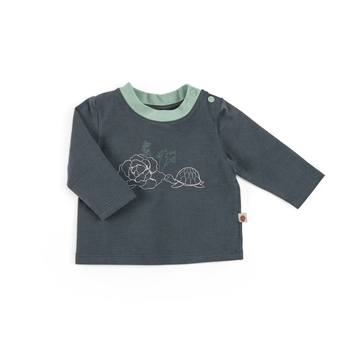 T-shirt en jersey de coton avec sérigraphie tortue et salade. Encolure et boutons-pression contrastés. Finition carbone et tissu gratté à l’intérieur.