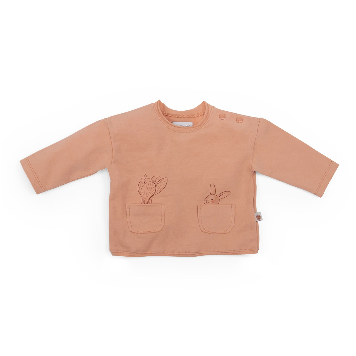 T-shirt noisette en jersey flammé. Poches plaquées avec imprimés chou et lapin. Roulotté à la taille et à l’encolure pour la finition.