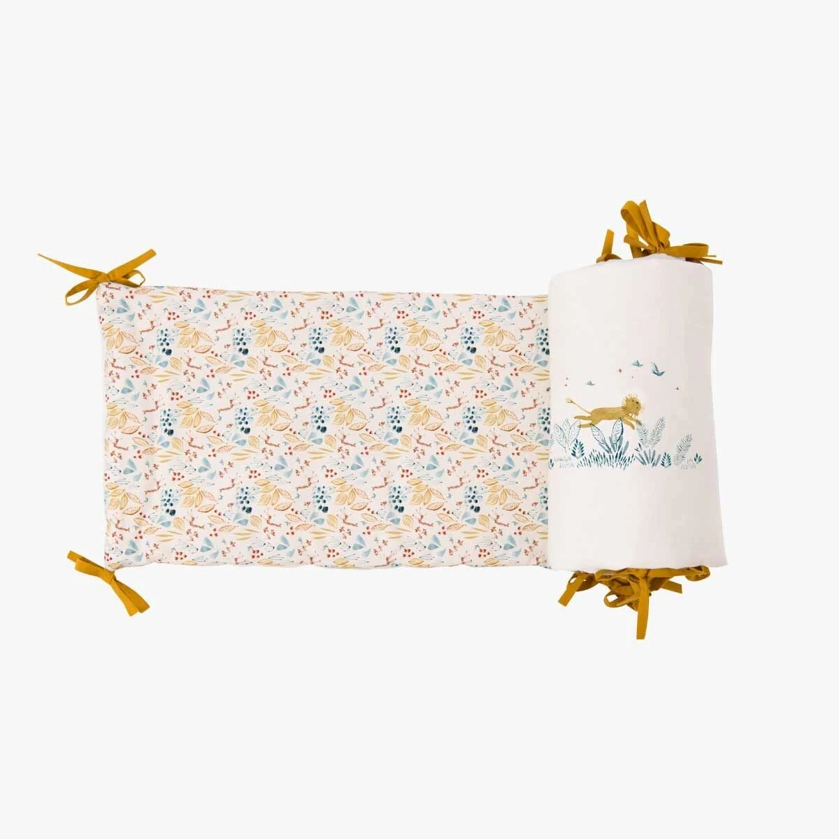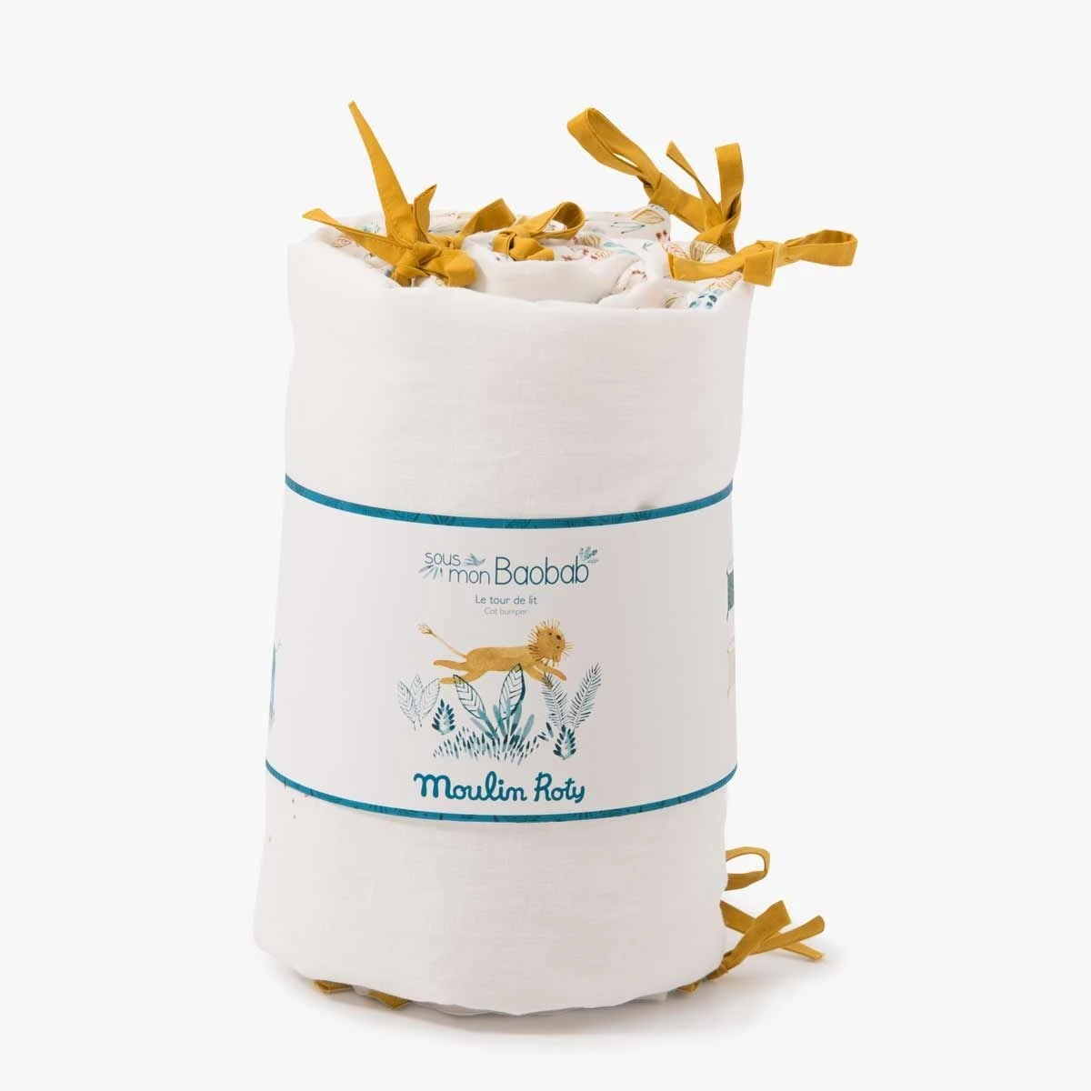 Tour de lit beige rembourré en lin lavé et coton très doux, avec liens jaune ocre, délicatement illustré des animaux de la collection : la girafe, l’éléphant et le lion. Il habillera le lit pour entourer bébé de douceur et décorer sa chambre.
