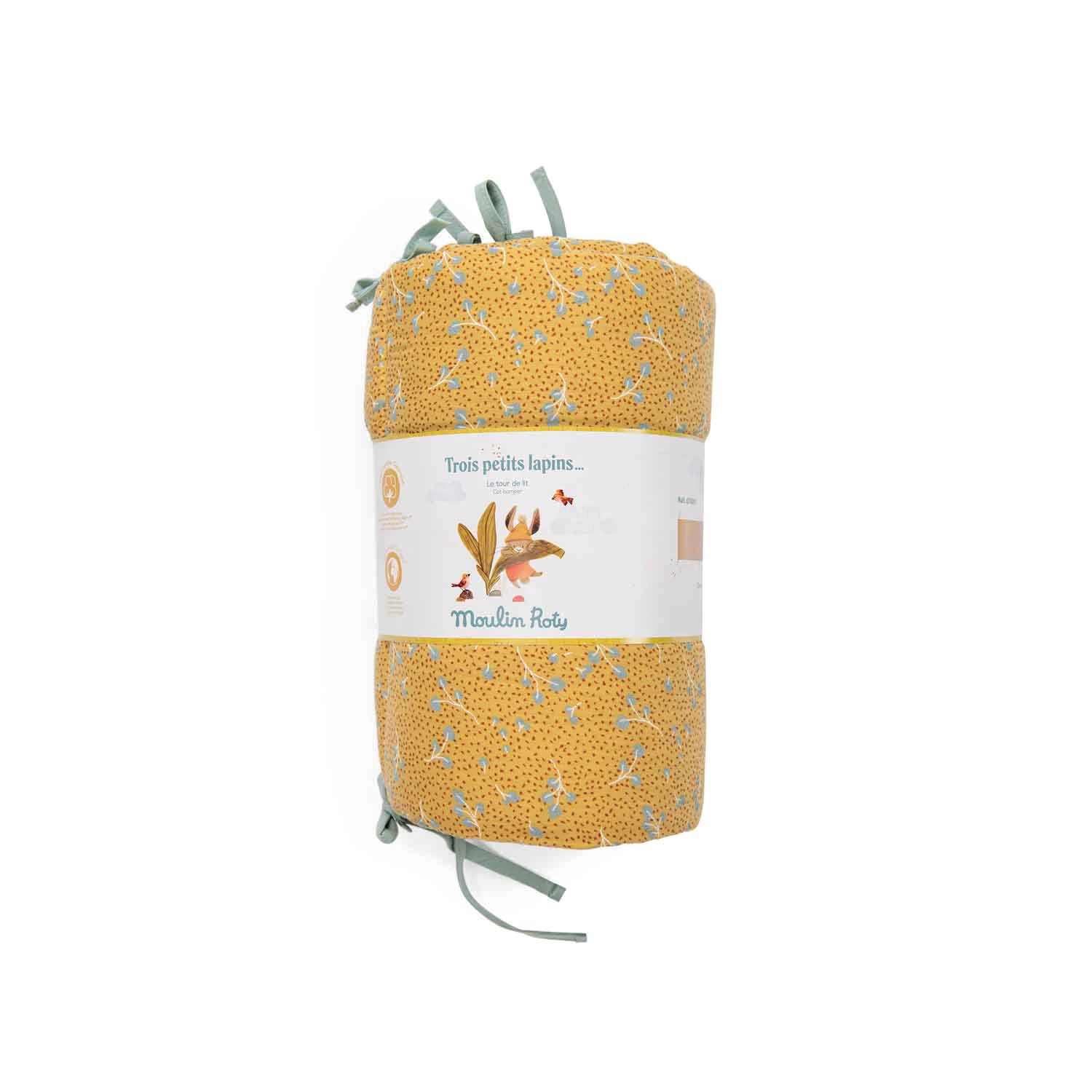 Tour de lit double épaisseur, en lange imprimé ocre, 100% coton certifié OEKO-TEX®. Moelleux et doublé de ouatine pour une bonne tenue, il s’accroche facilement tout autour du lit de bébé grâce à ses jolis liens de couleur sauge.