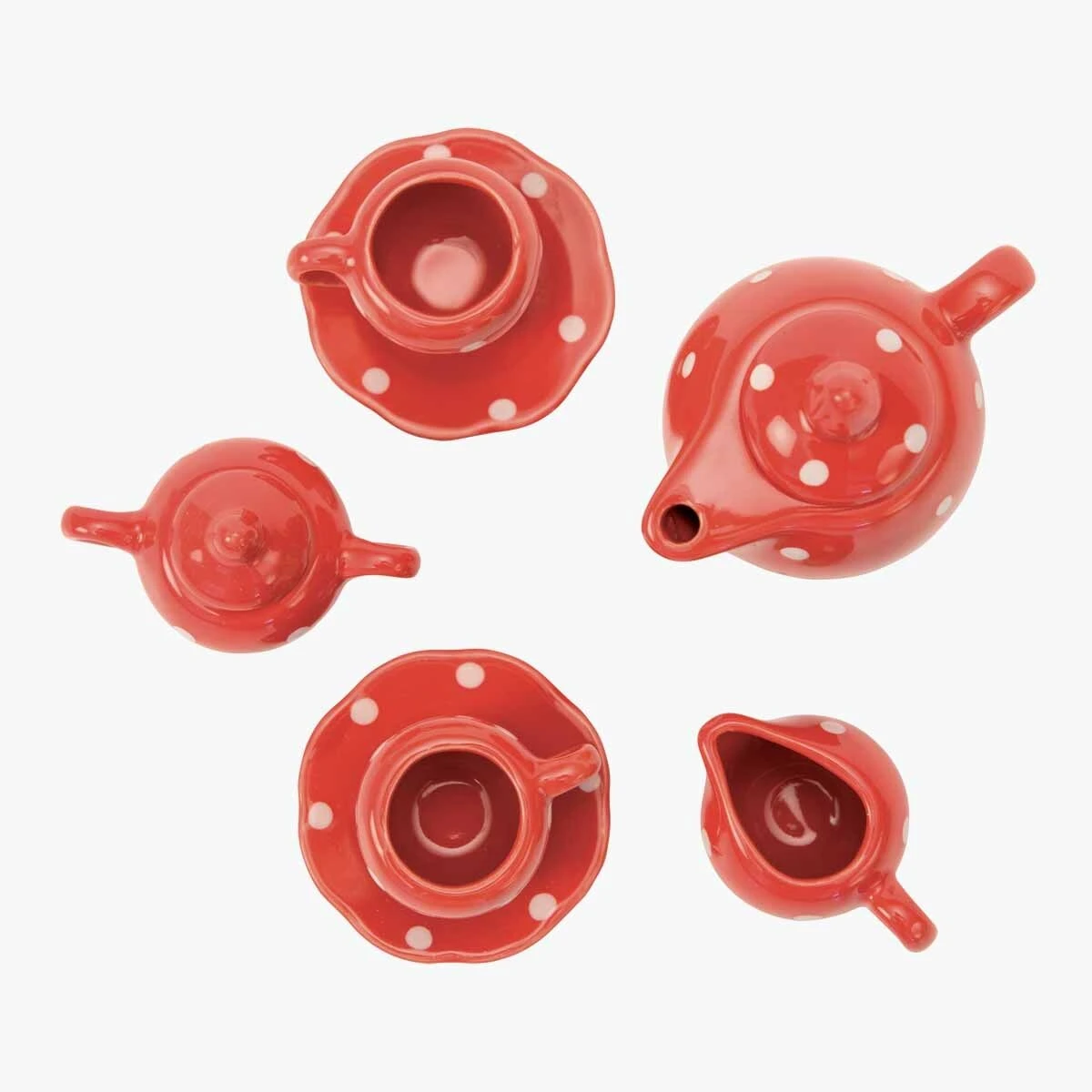 Valise à histoire, en carton imprimé et poignée métal, illustrée aux couleurs de La Grande Famille, comprenant un service à thé en céramique rouge à pois blancs pour jouer délicatement à la dînette.